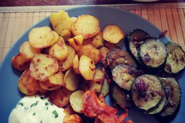 Bratkartoffeln mit Zucchinigemüse und Joghurtdip