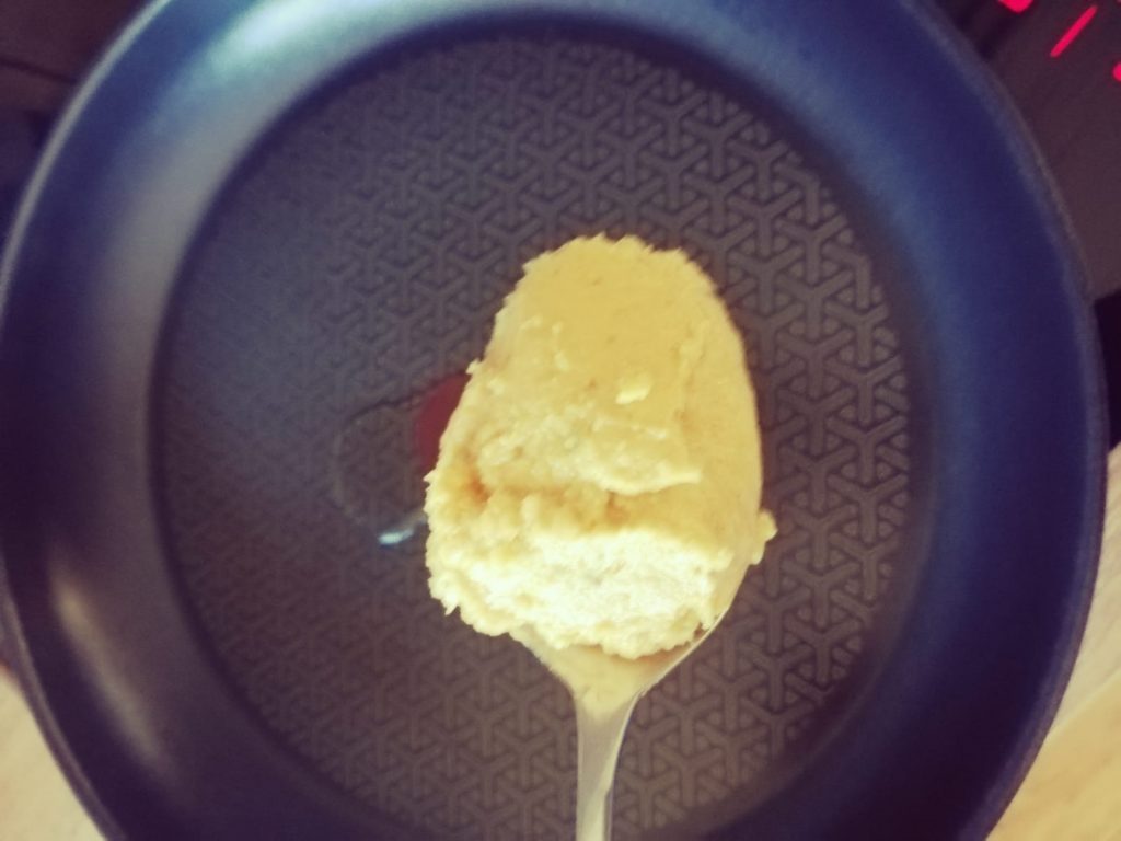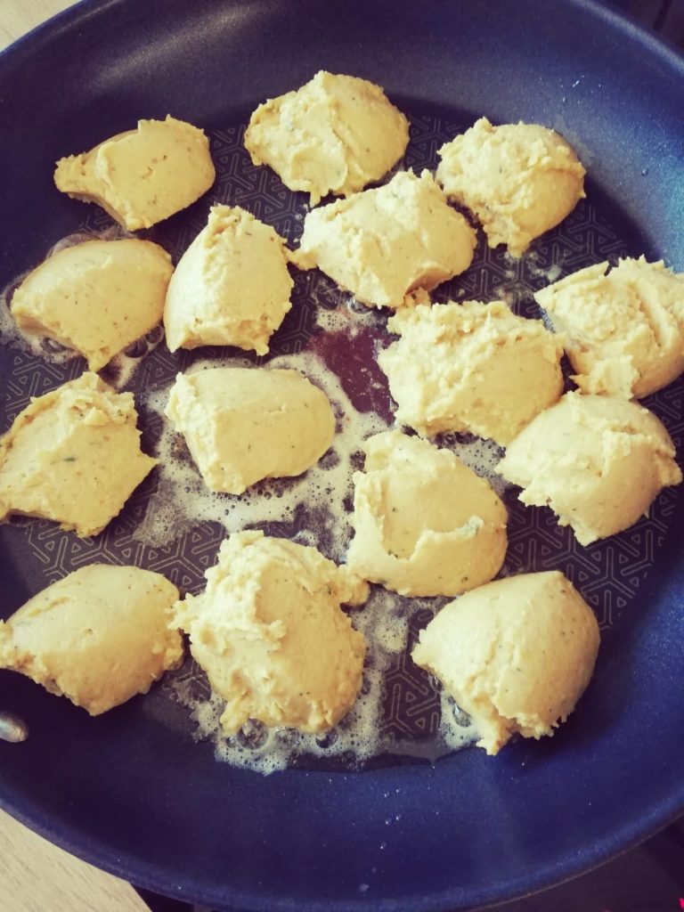 Jetzt eine beschichtete Pfanne mit einem guten Schuss Sonnenblumenöl heiß werden lassen und mit zwei Löffeln kleine Frikadellen formen und sie in die Pfanne geben.