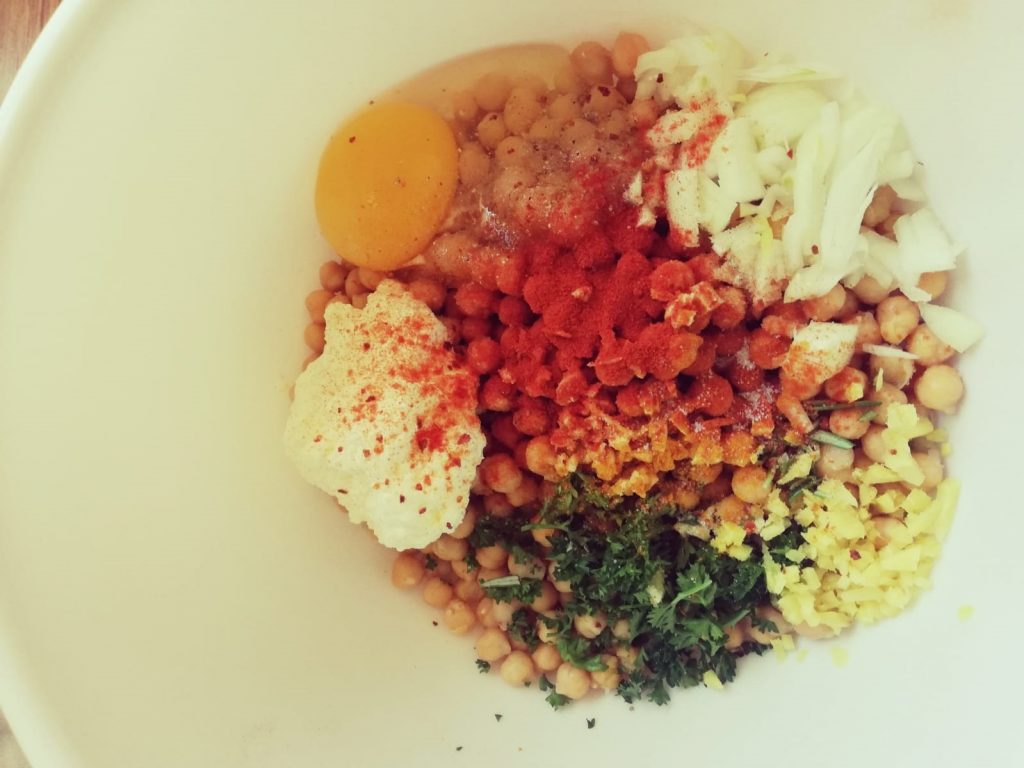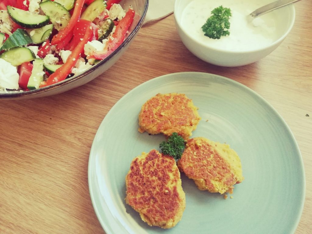 Kichererbsen Frikadellen sind inzwischen auch ein Klassiker unter Vegetariern und mich konnten sie definitiv auch überzeugen. Damit sie nicht zu trocken werden, verwende ich immer einen Esslöffel Schmand oder Creme Fraîche und dazu ein leichter Joghurtdip, ein kleiner Salat. Ist ein perfektes leichtes Mittagessen für heiße Tage oder auch am Abend schnell gemacht.