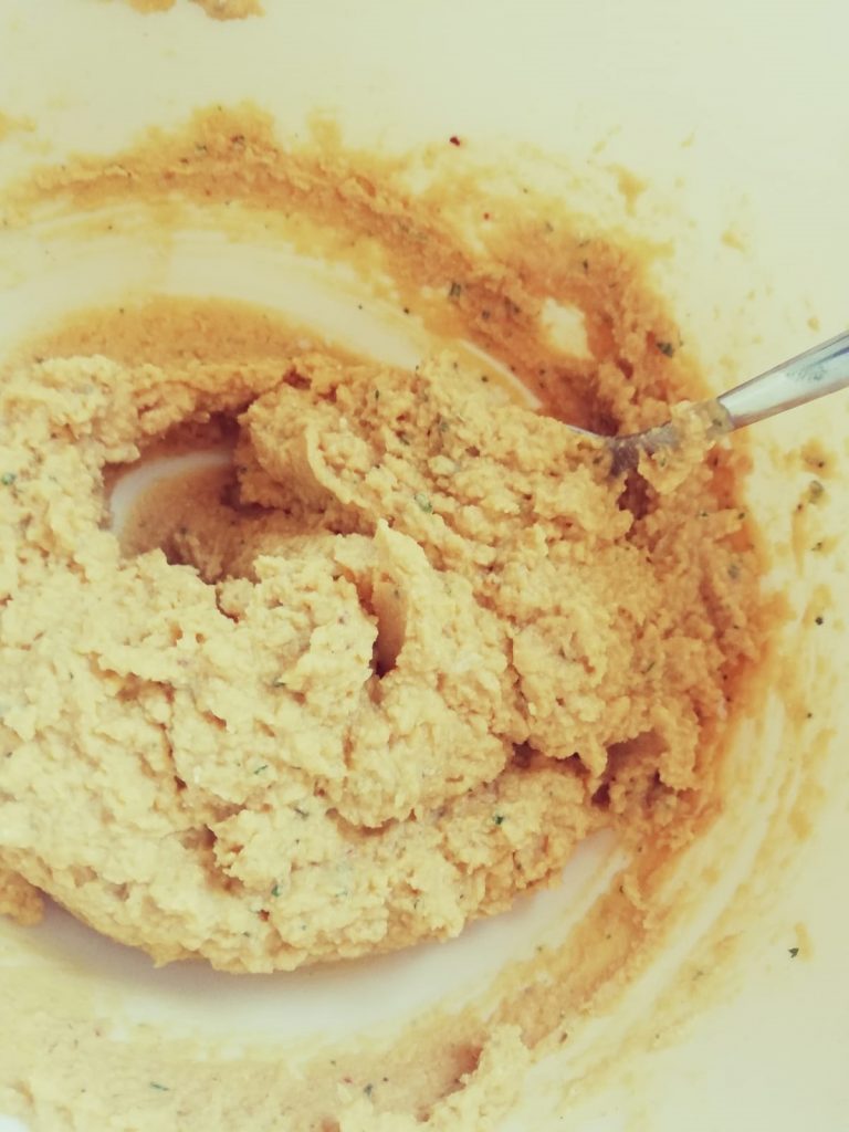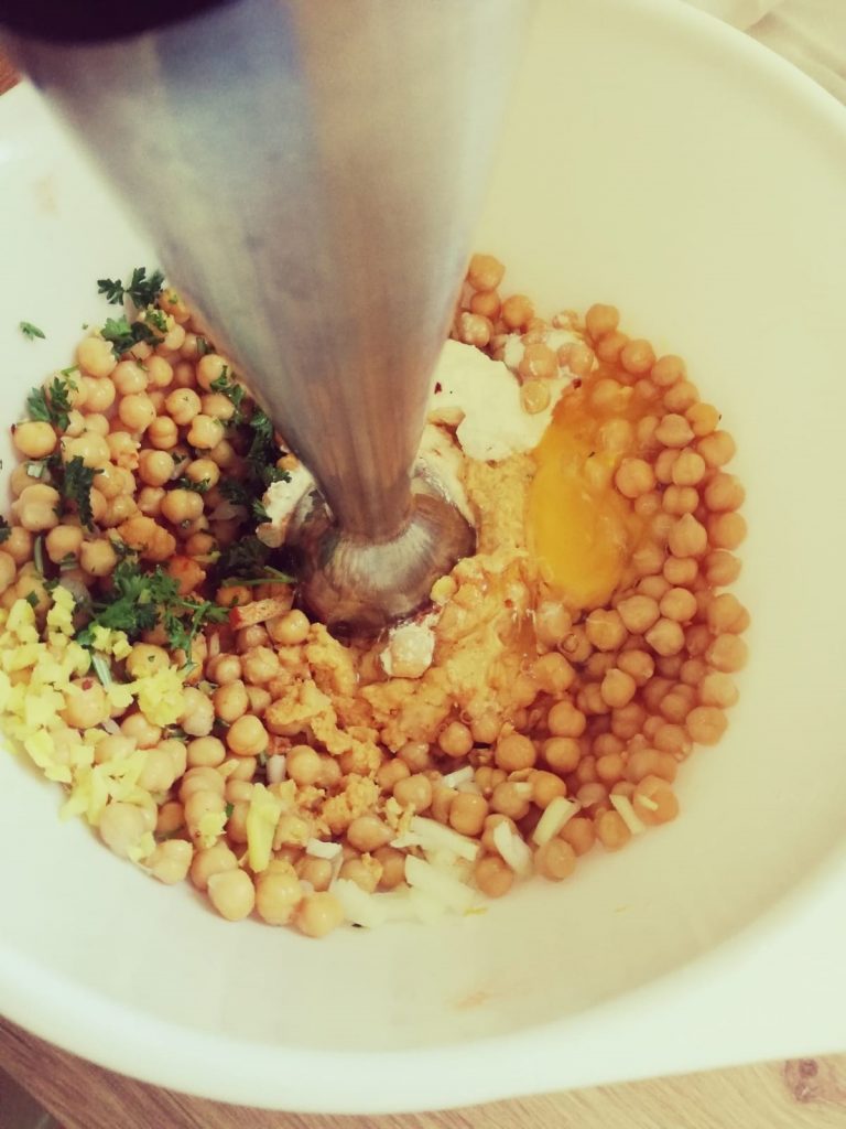 Die Kichererbsen in ein Sieb schütten und gut abwaschen. Dann in eine Schüssel füllen, in der auch püriert werden kann. Nun die Zwiebel, den Knoblauch und den Ingwer klein schneiden. Jetzt können alle Zutaten zu den Kichererbsen gegeben werden und mit einem Pürierstab zu einer Masse vermengen.