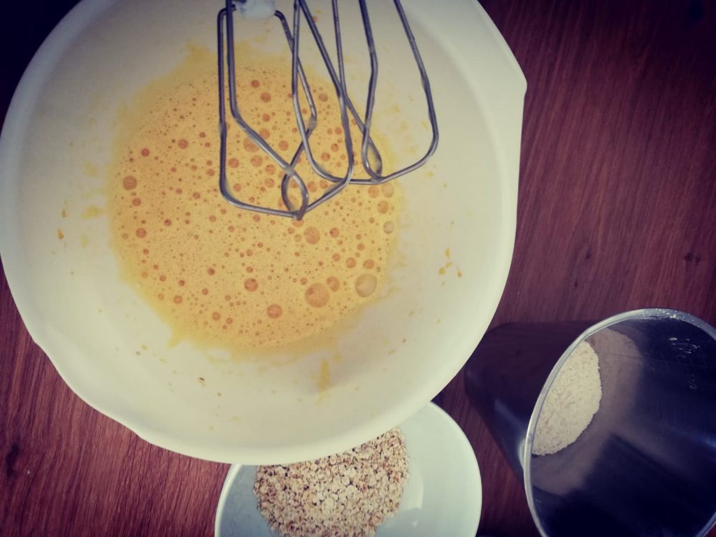 Zuerst vermische ich die trockenen Zutaten. Also Mehl, Haferflocken und Backpulver. Dann nehme ich eine neue Schüssel. In diese kommt der Zucker mit den Eiern, die zu einer Masse verquirlt werden.