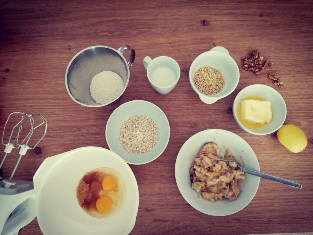 Jetzt fehlen nur noch die Haferflocken und die verschiedenen Nüsse, die ich mit einem großen Löffel oder einem Teigschaber unterhebe.