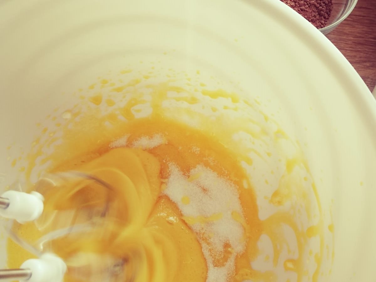 Nun das Eigelb mit 2 EL heißem Wasser schaumig rühren und nach und nach den Zucker dazugeben.