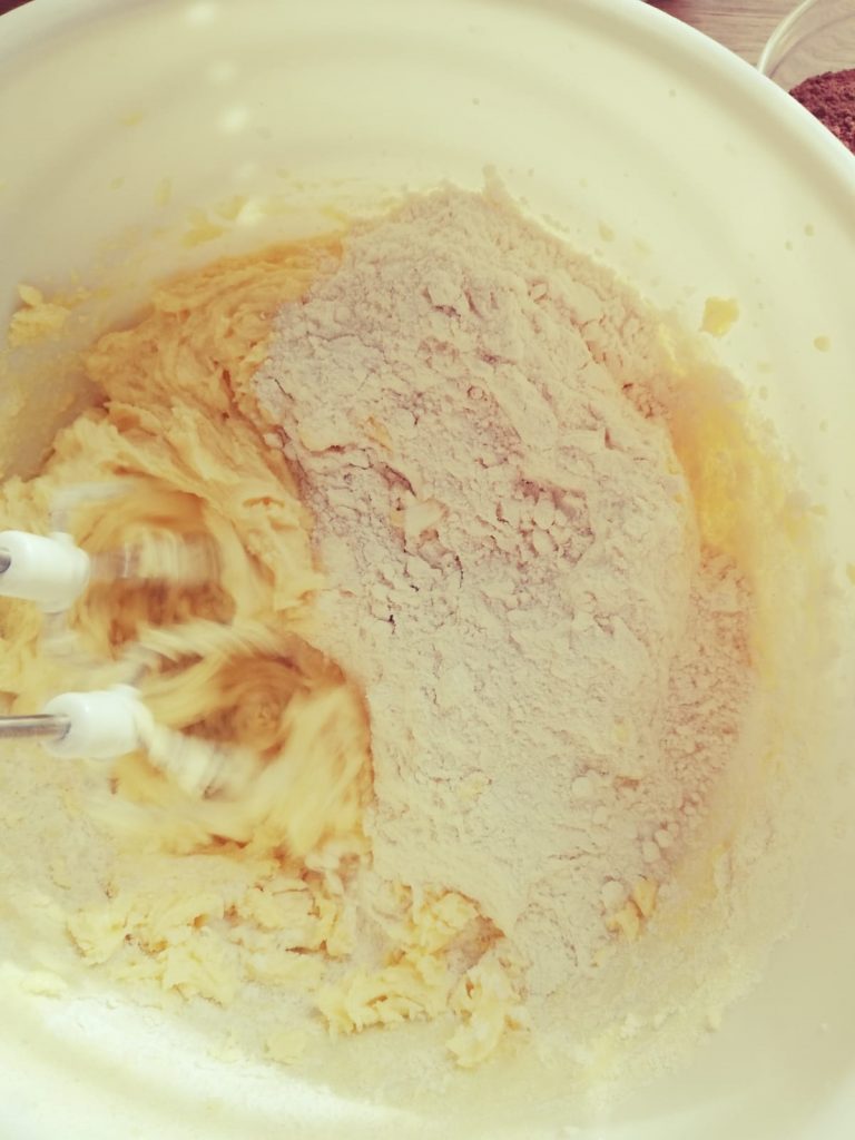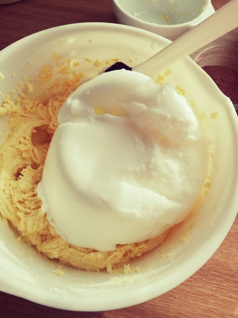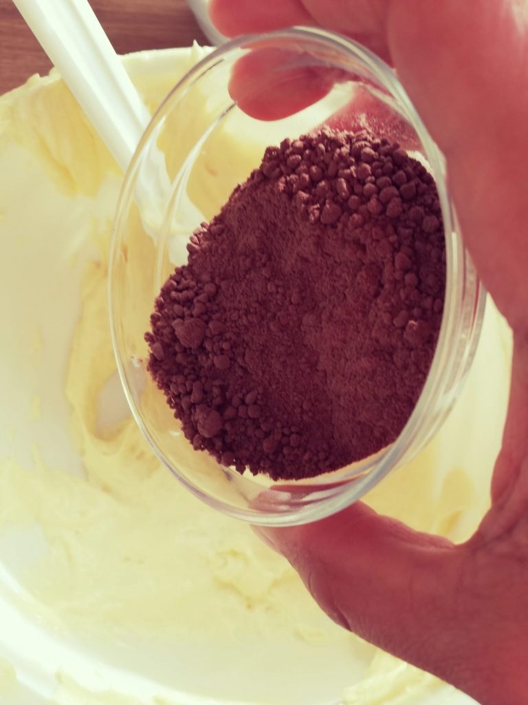 2/3 des Teigs auf ein Backblech geben, welches entweder mit Backpapier ausgelegt ist oder mit Butter eingestrichen. Dann zu dem restlichen Teig den Kakao geben und ebenfalls unterheben.