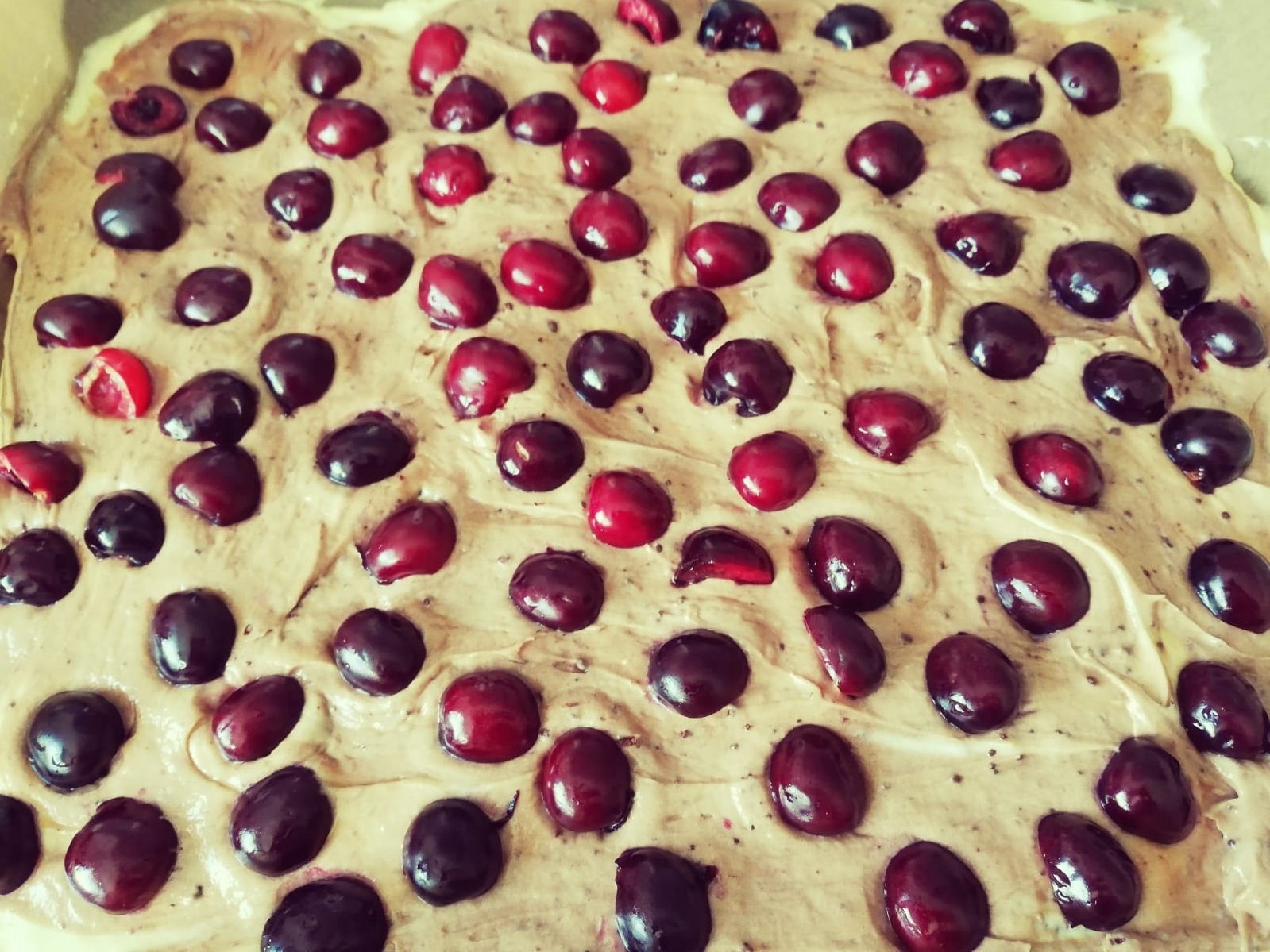 Den restlichen Teig über den anderen Teig streichen und jetzt nur noch die entkernten Kirschen auf dem Kuchen verteilen.