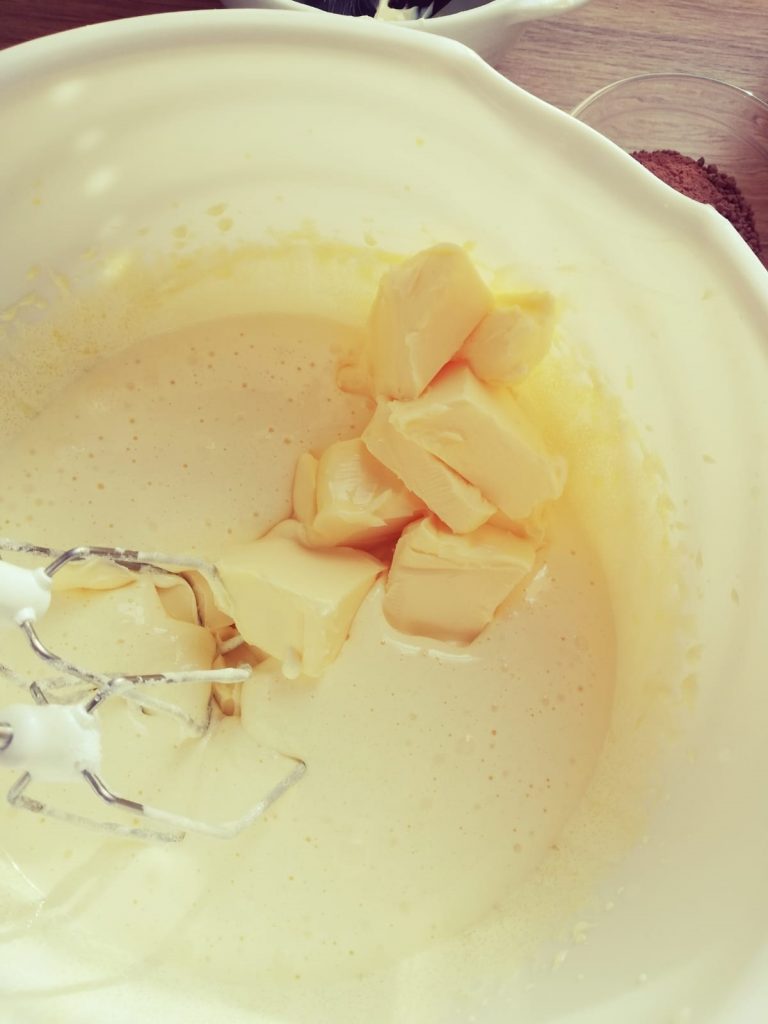 Zuerst den Backofen auf 180° Umluft vorheizen. Stellt euch alles bereit, dann Backpulver zum Mehl und Vanillezucker zum Zucker mischen. Die Butter in kleine Stücke schneiden, damit diese schneller weich wird. Dann die Eier trennen und das Eiweiß zu Eischnee schlagen.