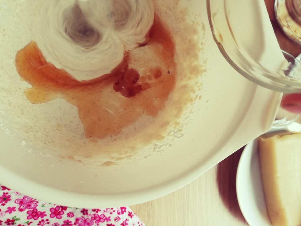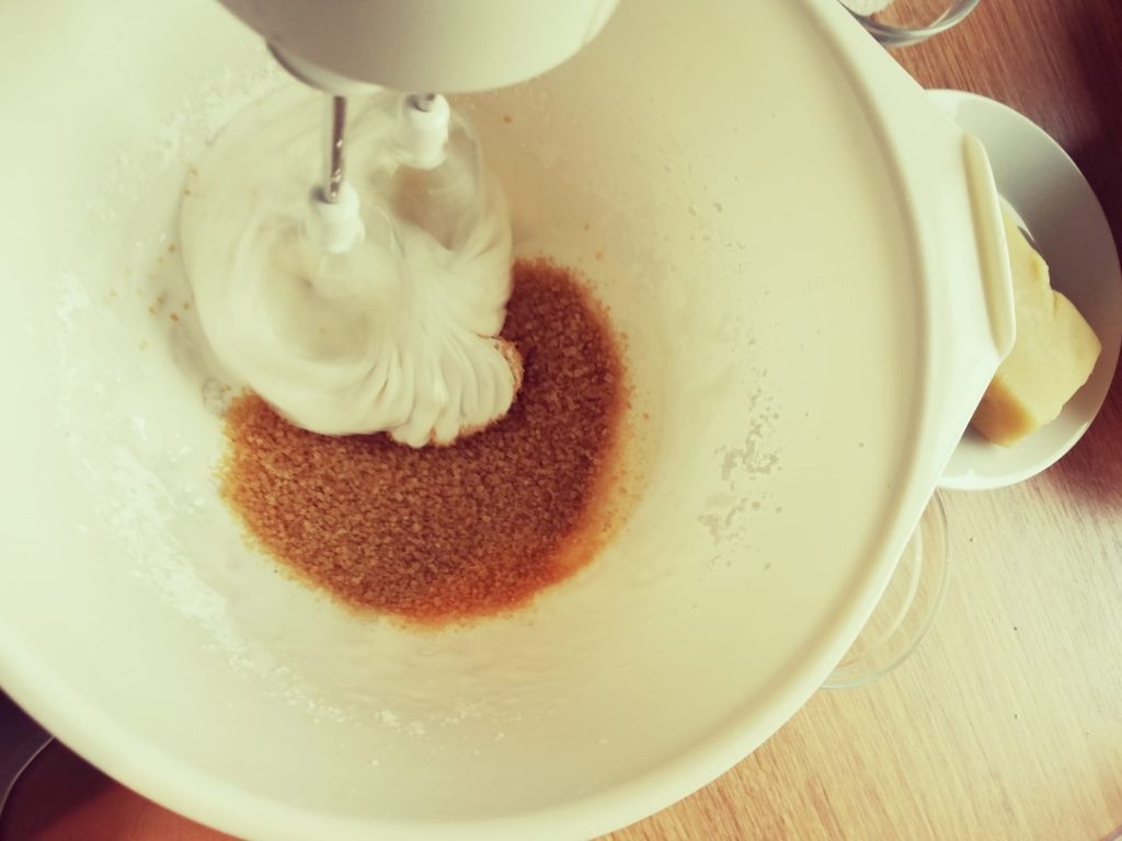 Die zwei Eiweiße etwas schaumig rühren und dabei den Puderzucker mit untermengen. Danach auch den Rohrzucker mit verrühren.