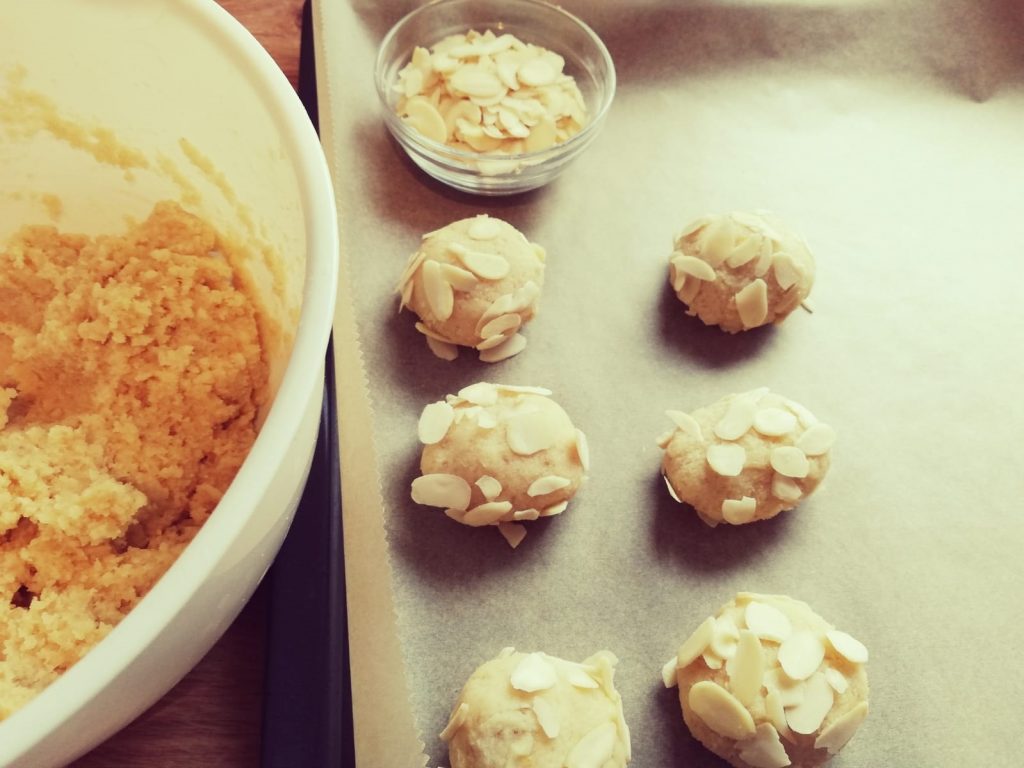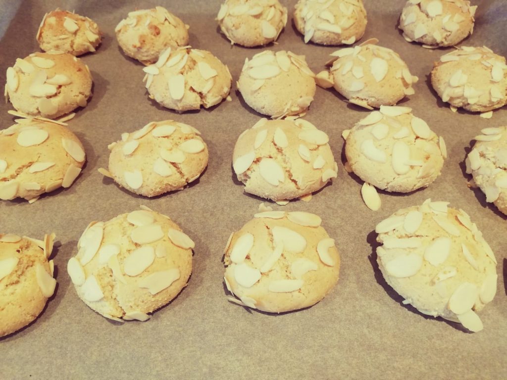 Die Masse kann in ca. 18 Mandorlini geformt werden und passen auf ein Backbleck. Dafür ungefähr 1 EL der Masse nehmen und zu Bällchen formen. Dieses Bällchen dann in durch die gehobelten Mandeln drehen und auf dem Backblech leicht andrücken.