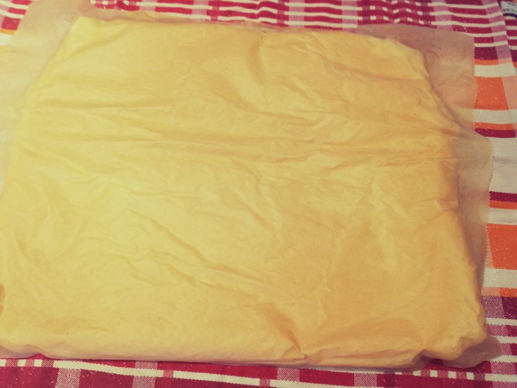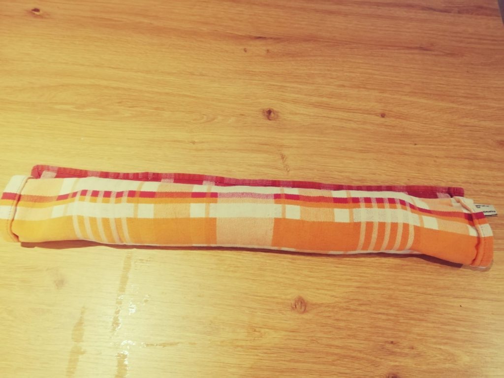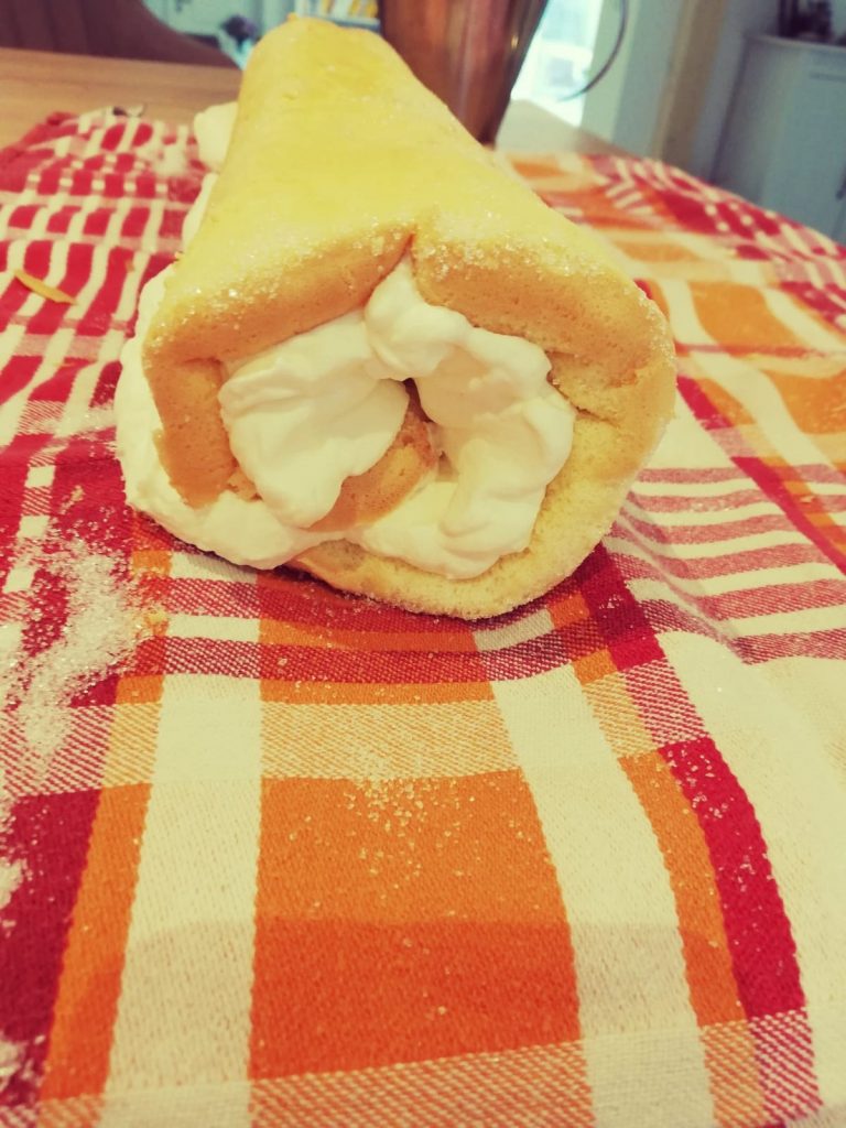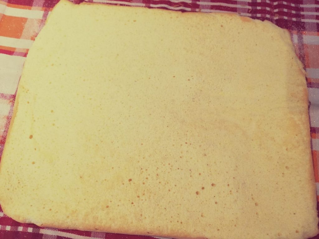 Nun das Geschirrtuch mit dem Biskuit eng einrollen und solange eingerollt lassen bis dieser ausgekühlt ist. Dauert ca. 30min.