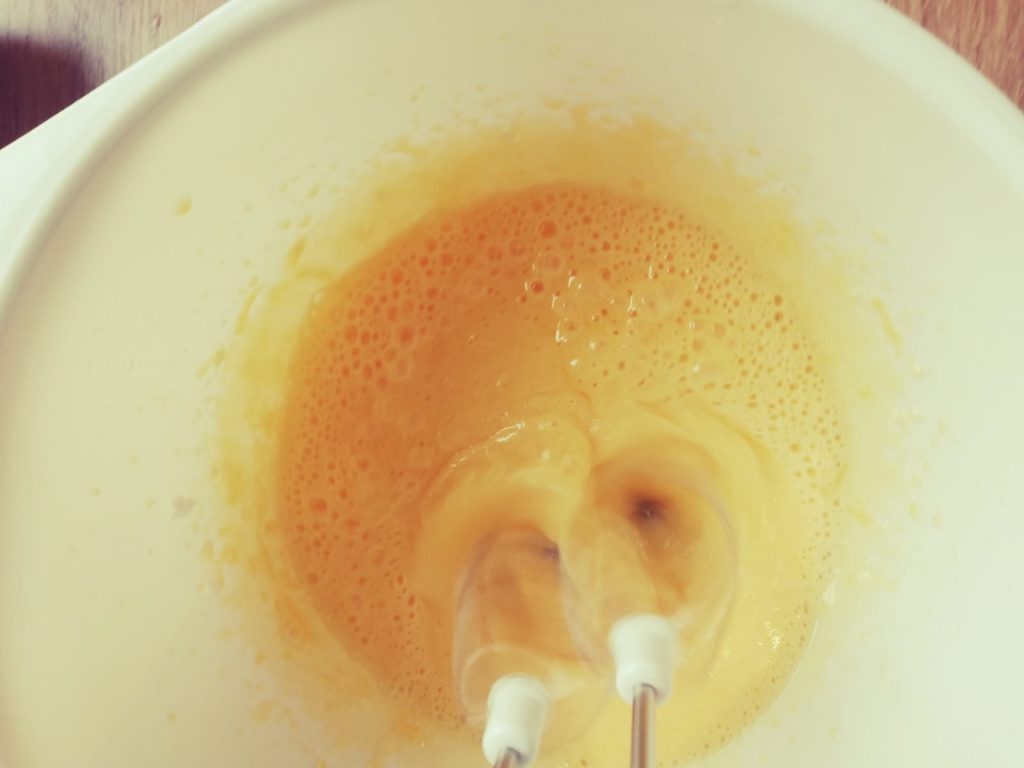 Den sehr festen Eischnee zur Seite stellen und das Eigelb mit dem warmen Wasser und dem restlichen Zucker solange verquirlen bis die Masse etwas weißlich geworden ist.