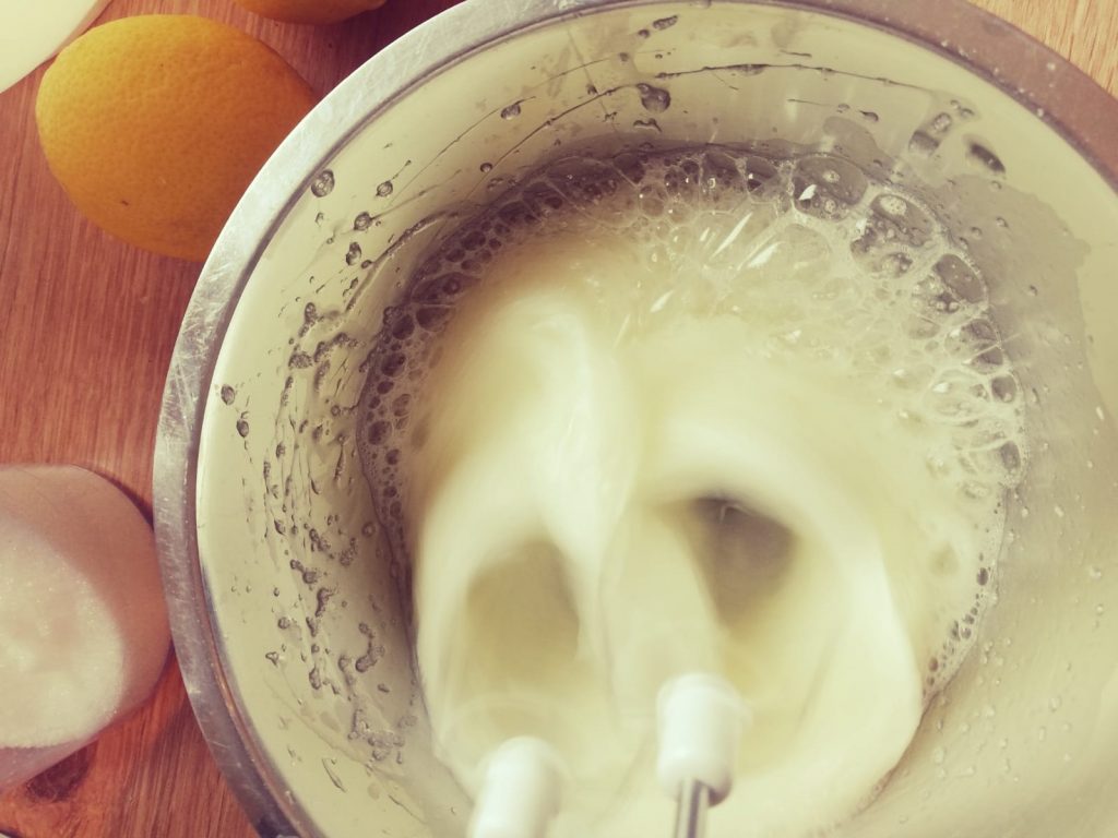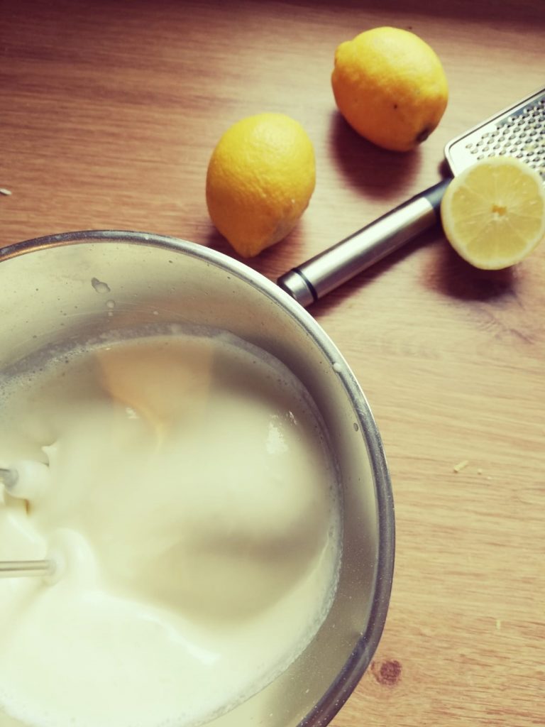 Dann kann die Zitronensahne vorbereitet werden. Dazu die Sahne mit den 2 EL Zucker, der anderen Hälfte des Zitrone als Abrieb und die Zitrone auspressen und den Saft davon hineingeben. Damit die Sahne auch hält, benötigt ihr ein Päckchen Sahnesteif.