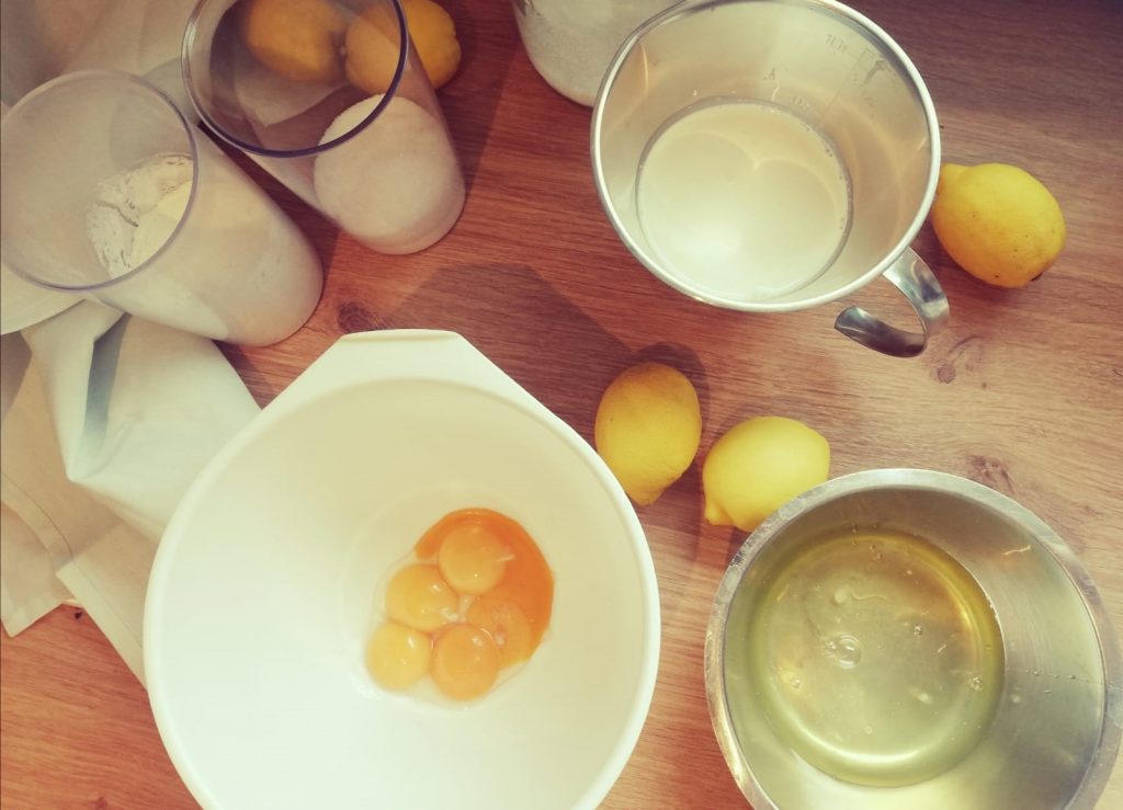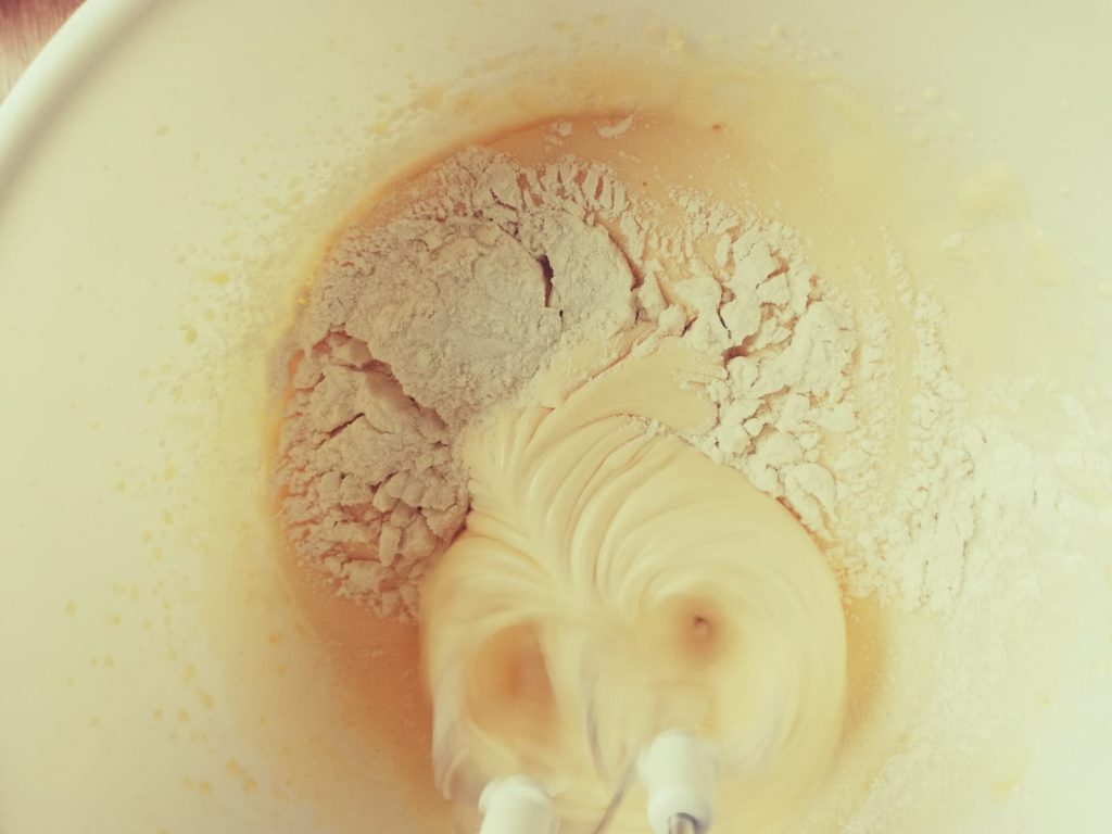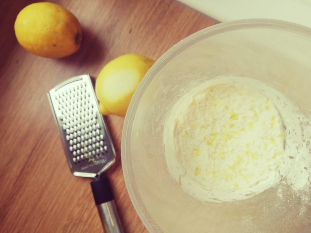 Dann das Mehl mit dem Backpulver vermengen und die Hälfte der Zitrone abreiben und in die Mehlmischung verrühren.