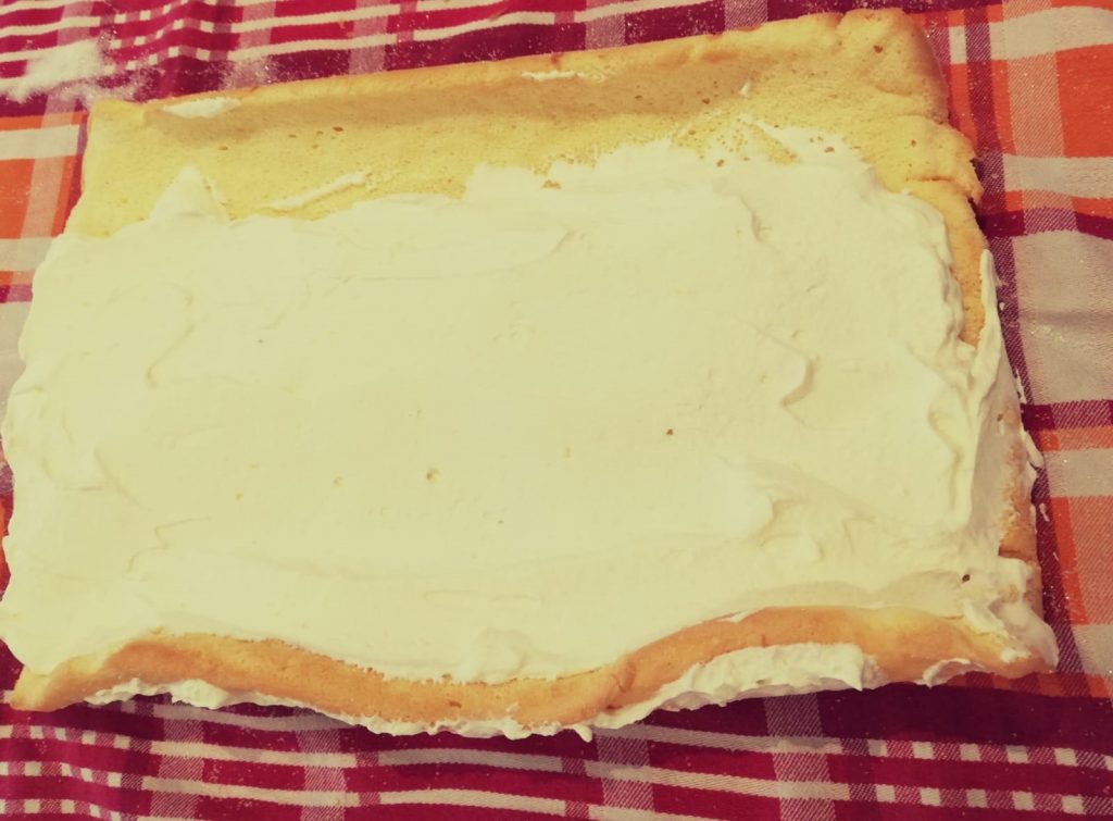 Und nun die Rolle wieder aufrollen und die Sahne gleichmäßig verteilen. Am Rand etwas Platz lassen, damit die Sahne dort nicht rausläuft.