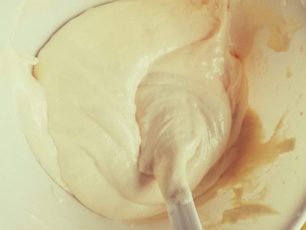 Diese Mischung nach und nach zu der Eigelbmasse hinzufügen.
