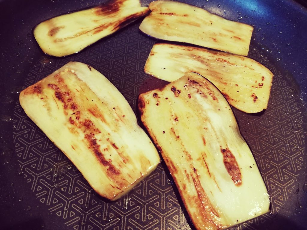 Zuerst den Backofen auf 180° Umluft vorheizen. Jetzt die Auberginen waschen, die Enden abschneiden und der langen Seite nach in dünne Scheiben schneiden. Diese dann in Olivenöl schön braun braten. Dabei immer eine Prise Salz und Pfeffer verwenden.