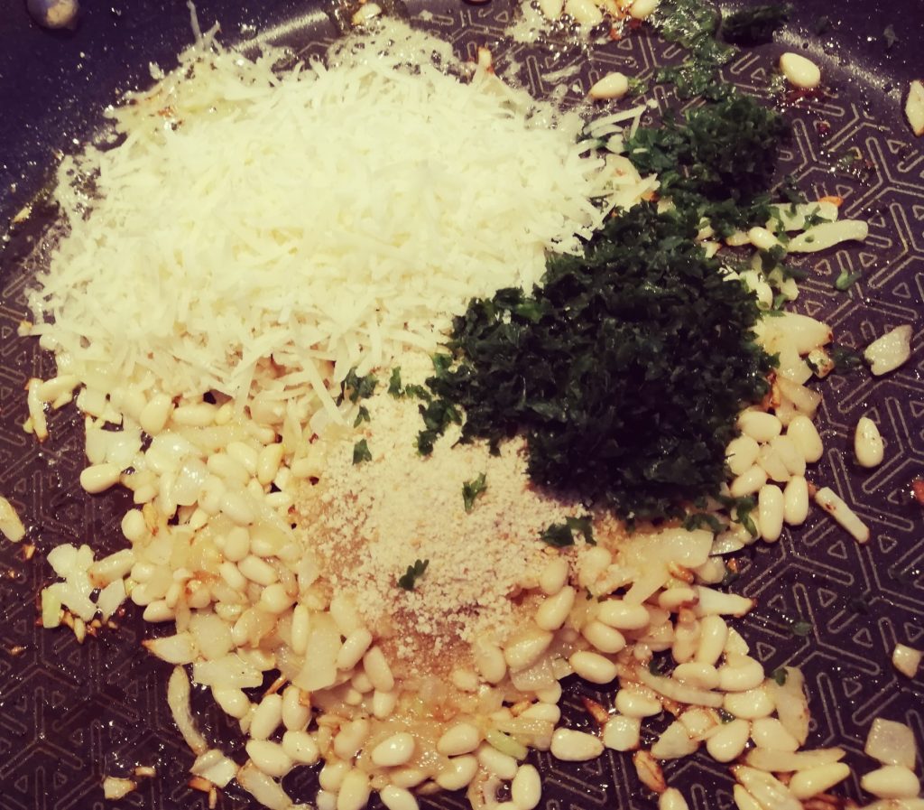 Nun aus der Pfanne nehmen und die Auberginen abkühlen lassen. Als nächstes die Zwiebel und den Knoblauch klein schneiden und ebenfalls in Olivenöl anbraten. Wenn Beides an Farbe gewonnen hat, können die Pinienkerne, der Parmesan, die Petersilie und das Paniermehl dazu.