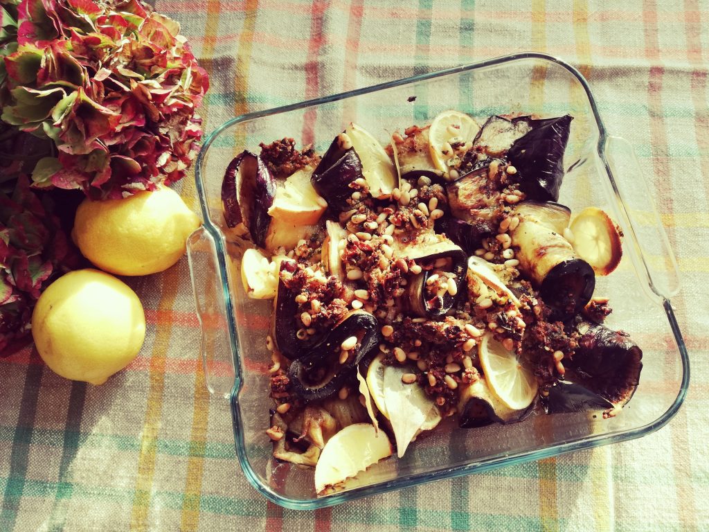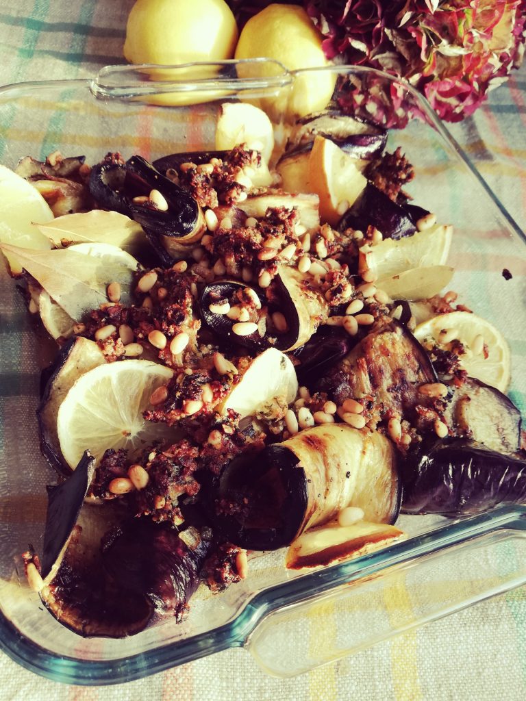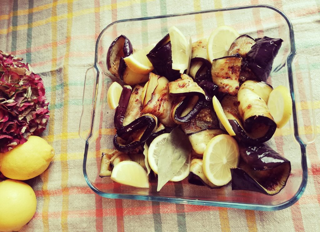 Das Ganze wird zu einer schönen klebrigen Masse. Jetzt die Zitrone in dünne Scheiben schneiden. Eine mittlere Auflaufform nehmen und die Auberginen einzeln rollen und in die Form „stellen“. Dazwischen werden die Zitronenscheiben gesteckt und die Lorbeerblätter verteilt.
