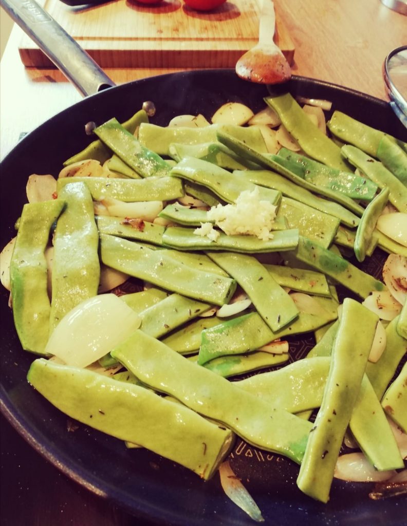 Den Knoblauch fein hacken und mit den Bohnen zusammen in die Pfanne geben, alles durchmischen und mit Deckel ein paar Minuten dünsten.