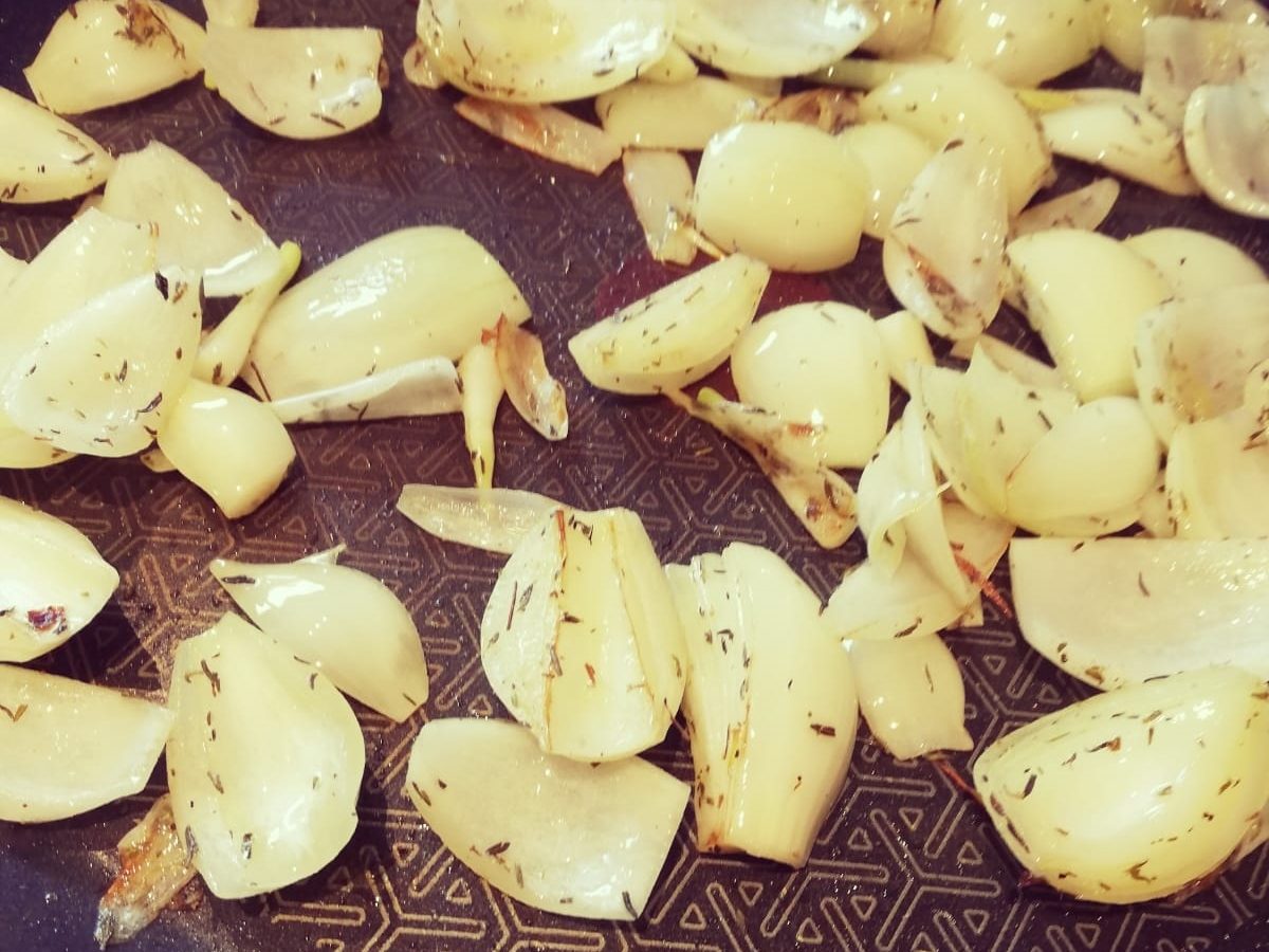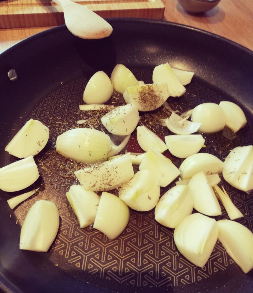 Die Zwiebeln schälen und vierteln. Eine Pfanne mit dem Olivenöl erhitzen und die Zwiebeln darin dünsten. Thymian kann auch direkt mit hinein.