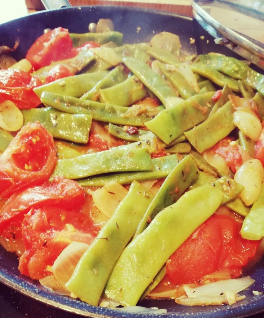 Eine mediterrane Beilage, die zu Reis, Kartoffeln oder auch griechischen Reisnudeln passt, ist dieses leckere Gemüse. Bohnen in Tomaten mit geschmorten Zwiebeln. Bohnen werden viel zu oft unterschätzt, da es wirklich darauf ankommt die richtige Garstufe zu erwischen. Da die Tomaten viel Wasser haben und dadurch automatisch eine Sauce entsteht, wird es aber einfach die richtige Konsistenz zu bekommen.