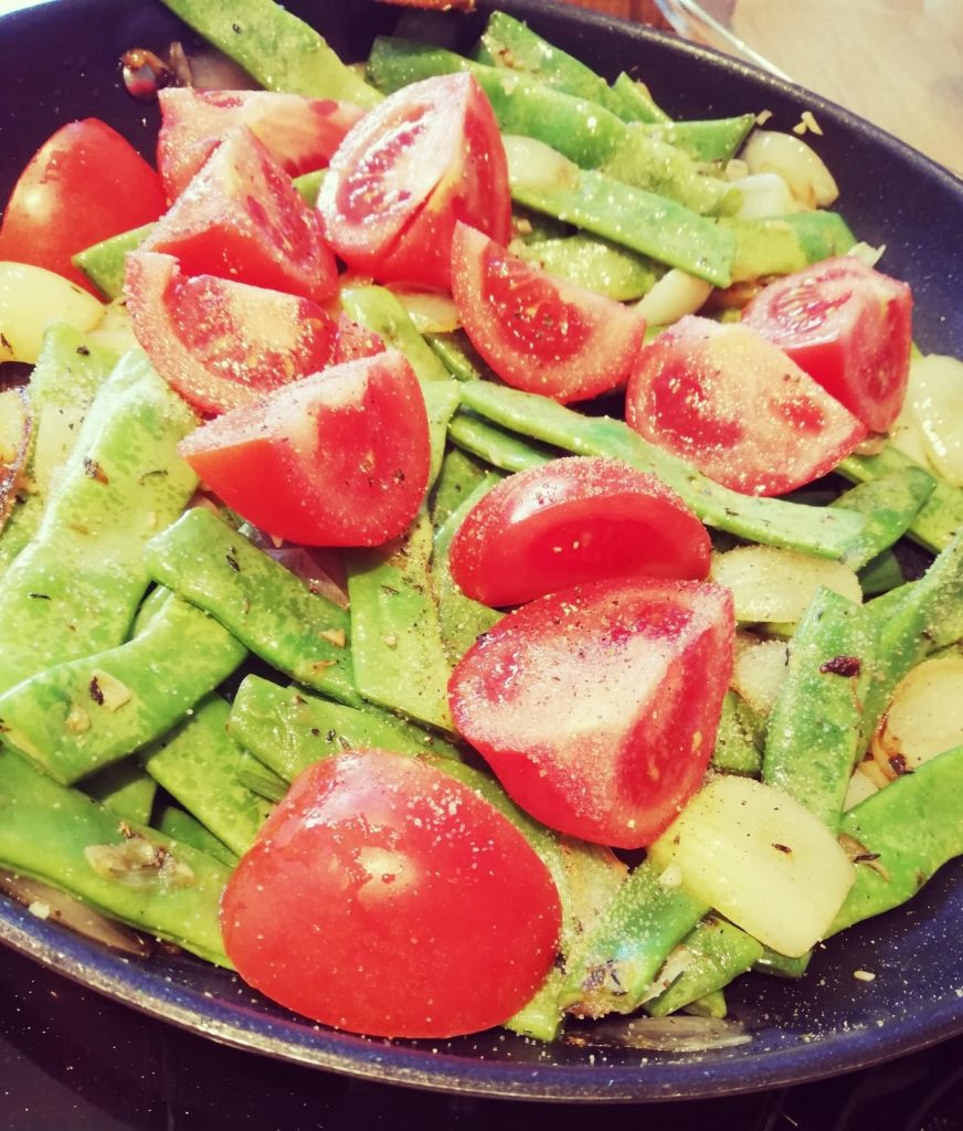 Die Tomaten vierteln und wenn die Bohnen etwas mehr Farbe bekommen haben, die Tomaten mit Salz und Pfeffer dazugeben.