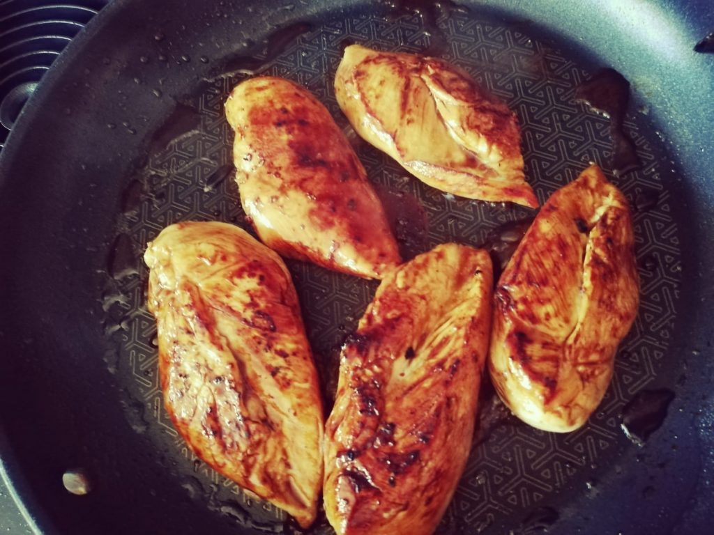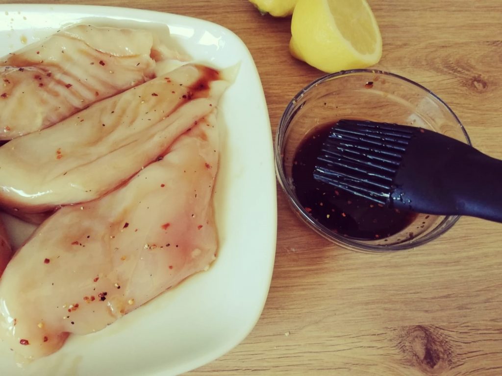 Für die Fleischliebhaber kommt jetzt die Zubereitung des Hähnchens. Dafür die Sojasauce mit dem Honig, den Chiliflocken und der Zitrone verrühren. Das Hähnchen damit einpinseln und den Rest zur Seite stellen.