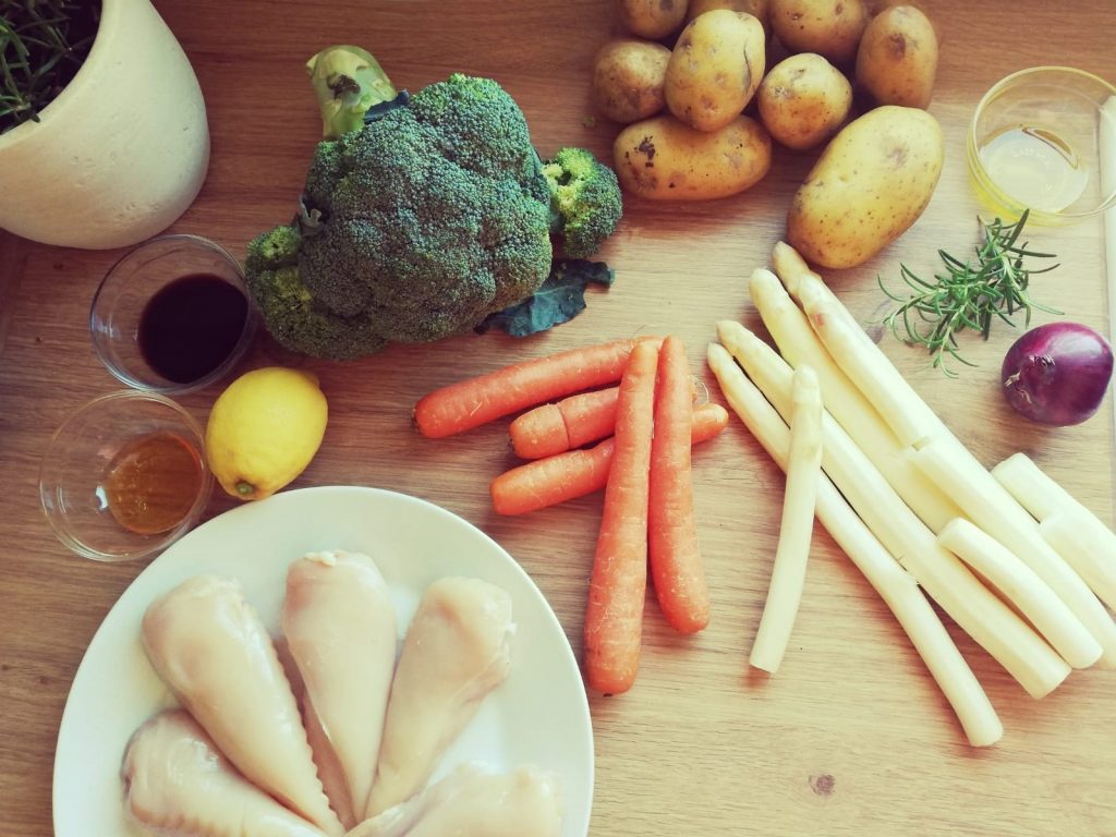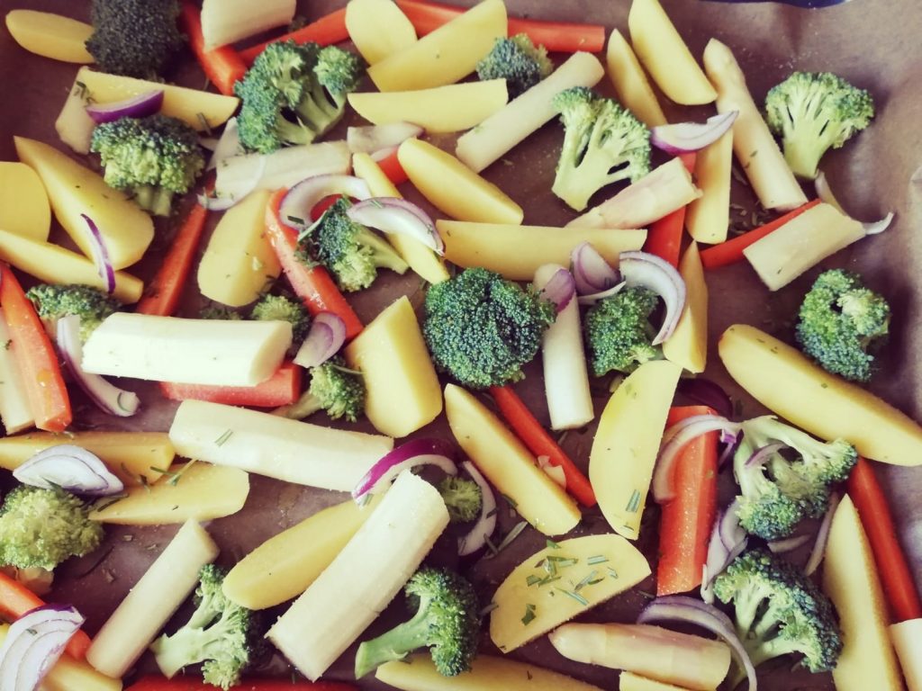Zuerst wird der Backofen auf 220° Ober/Unterhitze vorgeheizt. Dann muss das Gemüse muss in jedem Fall gewaschen werden. Ob die Kartoffeln und Karotten geschält werden, kann jeder selbst entscheiden. Muss nicht sein und spart Arbeit. Ich mach es mal so, mal so. Den Brokkoli in Röschen teilen, die Möhren in Stifte, die Kartoffeln achteln und den Spargel dritteln. Die Zwiebel schälen und in dünne Streifen schneiden. Den Rosmarin von seinen Zweigen befreien und hacken. Dann alles gleichmäßig (bei der Menge habe ich zwei Backbleche genommen) auf dem Backblech verteilen. Das Gemüse sollte nicht aufeinander liegen. Bis auf die Zwiebeln. Dann salzen, das Öl gleichmäßig verteilen und für 40 min. in den Ofen schieben.