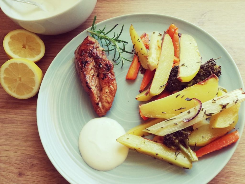 In der Zeit kann der Joghurtdip zubereitet werden. Die oben genannten Zutaten vermengen und fertig 🙂 Jetzt müsste das Gemüse auch kross sein. Nur noch alles zusammen anrichten und zugreifen.