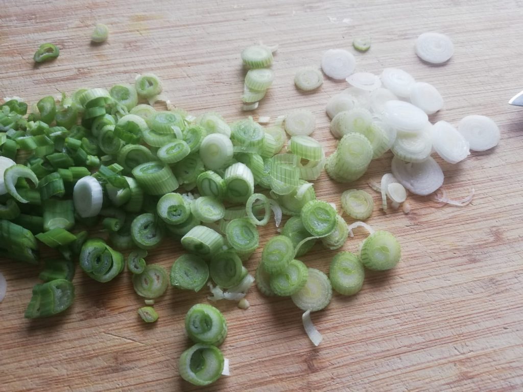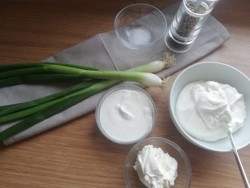 Bis auf die Frühlingszwiebeln alles miteinander vermischen. Dann die Frühlingszwiebeln in dünne Scheiben schneiden und 2/3 unterrühren und den Rest als Dekoration obendrauf.