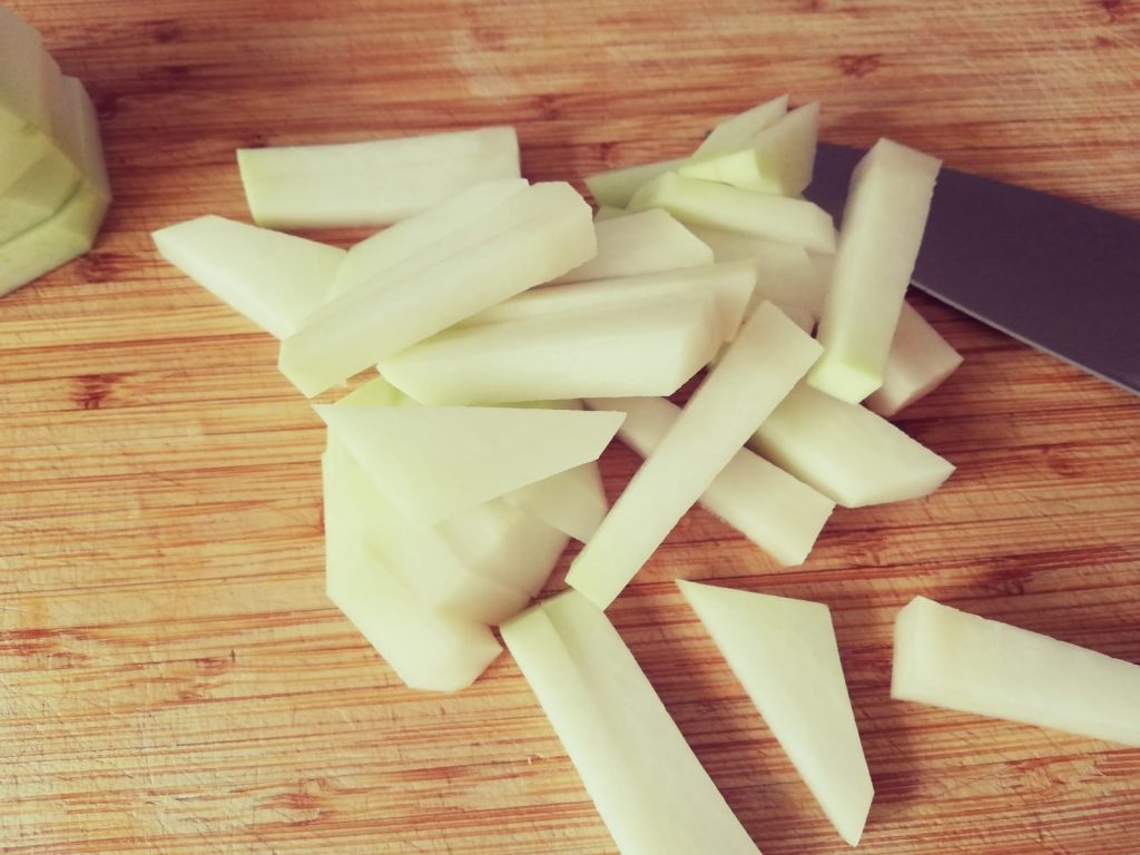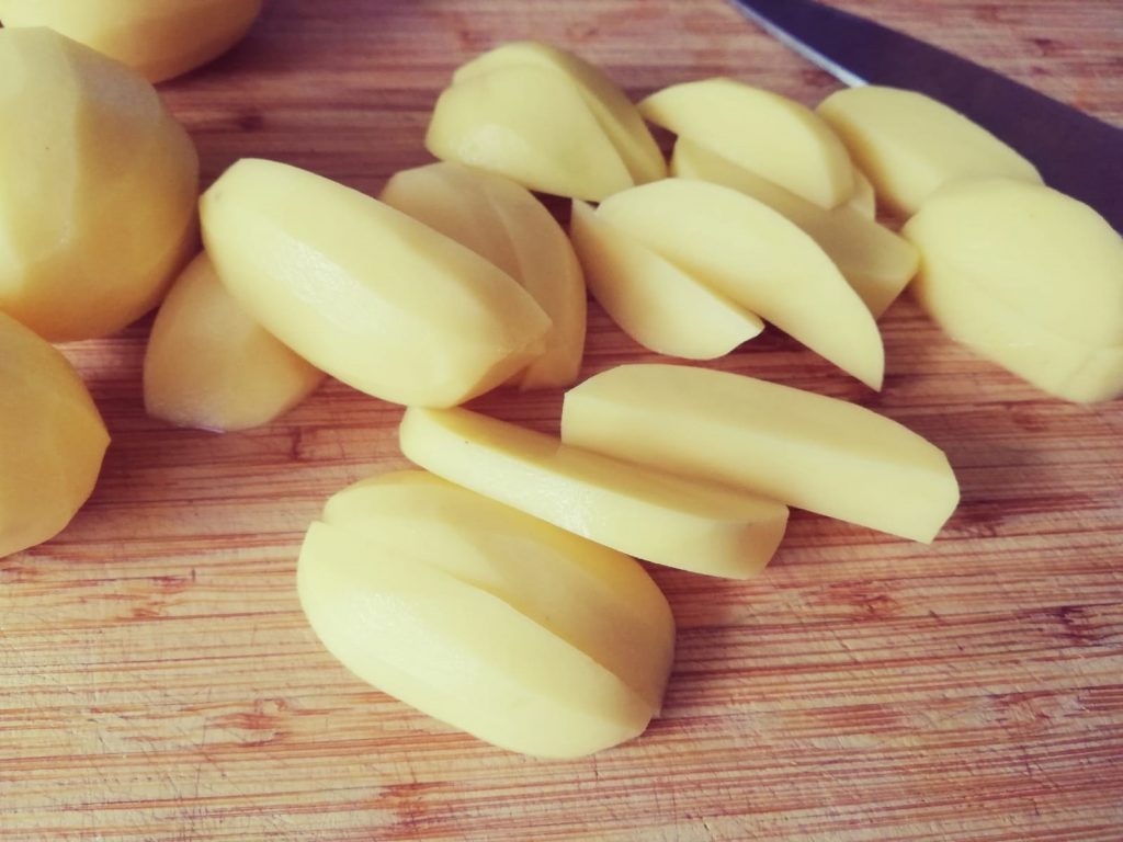 Nun die Kartoffeln in Streifen schneiden und ebenfalls in den Gemüsetopf geben.
