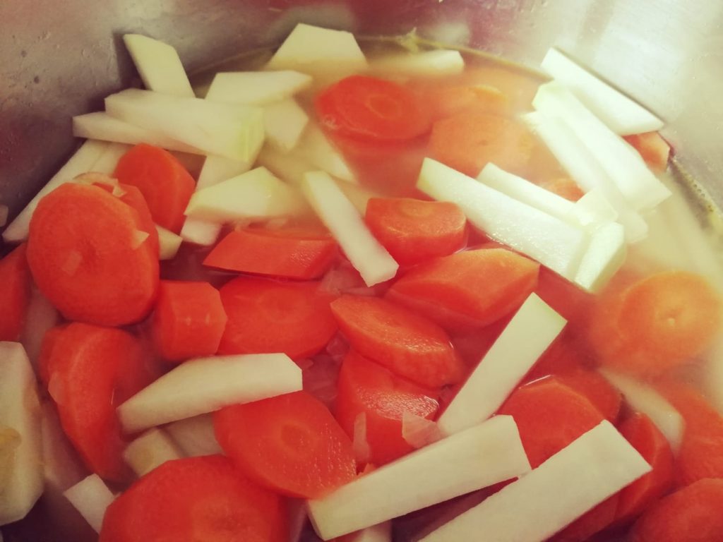 Wenn die Zwiebel-Möhren-Kohlrabi Mischung etwas gebrutzelt hat, wird mir Wasser aufgefüllt, aber nur soweit, dass das Gemüse noch überhand hat (siehe Bild). Jetzt die Gewürze zufügen.