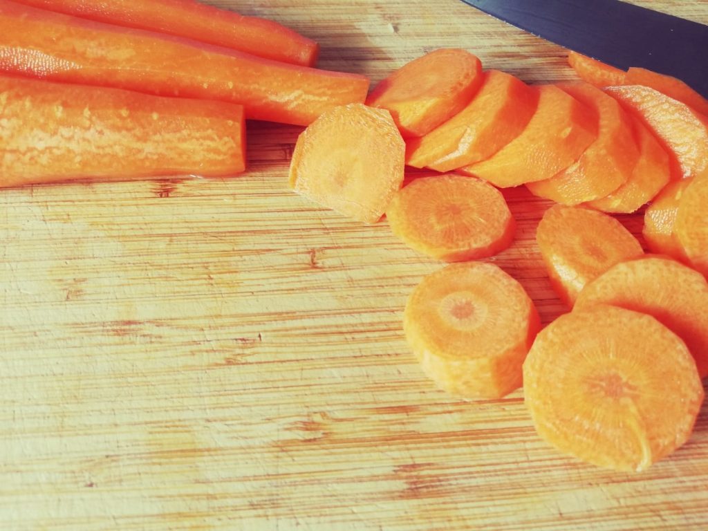 Dann die Möhren in Streifen schneiden und ebenfalls in den Topf geben.