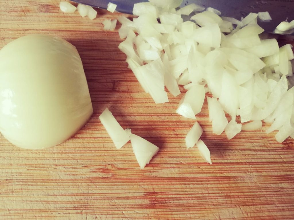 Gemüse schälen und waschen. Dann einen ausreichend großen Topf wählen und etwas Fett zum erhitzen hineingeben. Ich nehme bei diesem Gericht am liebsten ein Stück Butter. Als erstes die Zwiebel in kleinen Stücken auf mittlerer Hitze dünsten.