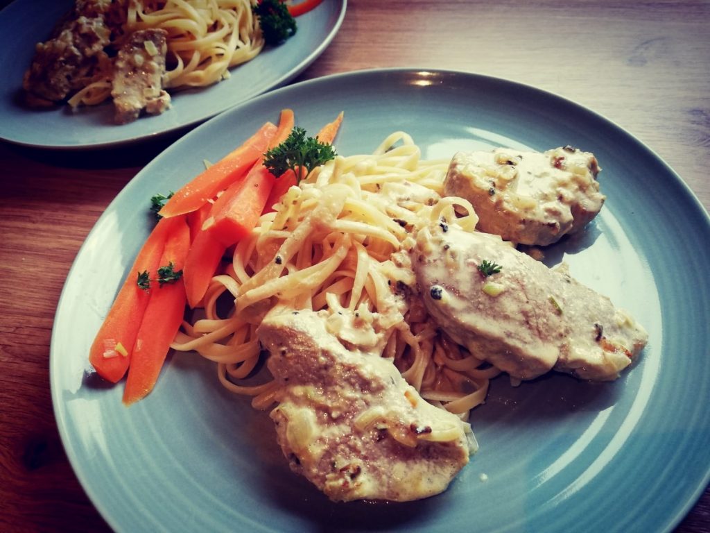 Dieses tolle Gericht könnt ihr in 30 min. zaubern und könnt damit eure Gäste oder Familie begeistern. Das Schweinefilet in der Kombination mit dem grünen Pfeffer, Senf und Sahne bringt einen besonders kräftigen Geschmack hervor, der hervorragend zu den Bandnudeln und den blanchierten Möhren passt. Falls es bei Euch auch zu einem Wochenende gehört, etwas Besonderes auf den Tisch zu bringen, dann ist dies ein Gericht, das dazu passt. Ich garantiere Euch freudige Gesichter 🙂