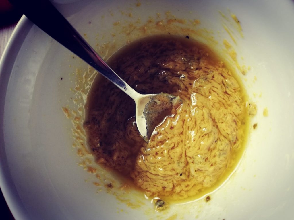 Dann den Knoblauch dazu pressen, das Olivenöl, den Senf sowie ein halber Teelöffel Salz und 3 Prisen schwarzer Pfeffer.