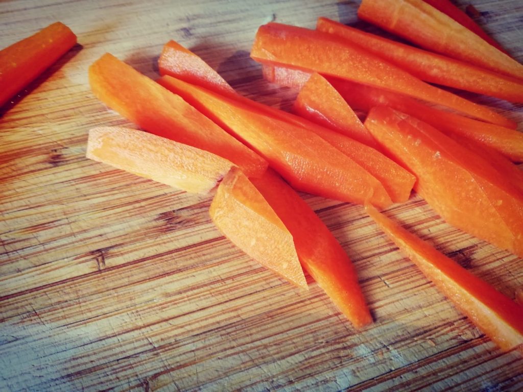 Jetzt die Möhren schälen und in Streifen schneiden.