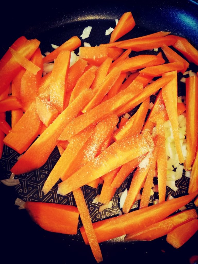 Nun eine der Zwiebeln in feine Stücke schneiden und mit etwas Fett anbraten. Die Möhren können direkt dazu gegeben werden sowie eine Prise Zucker (Möhren entfalten dadurch ein besonderes Aroma).