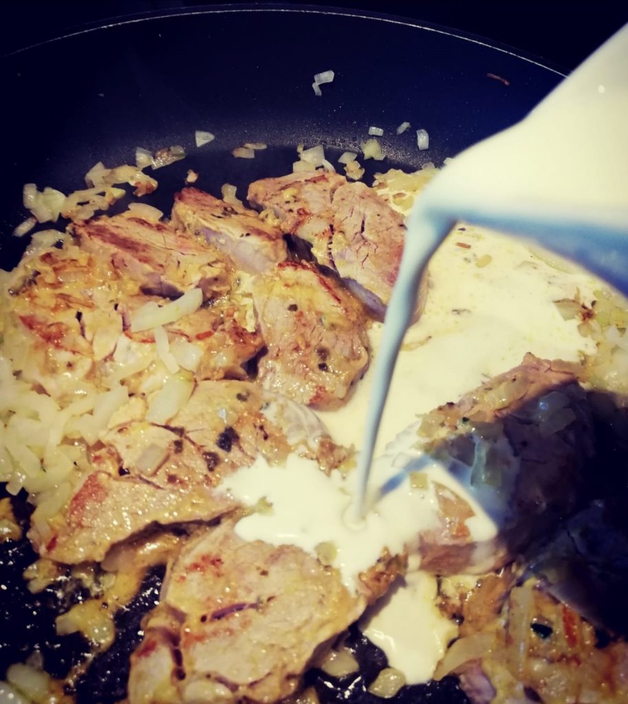 Das Fleisch sollte noch nicht durchgebraten sein, wenn die Sahne dazukommt.