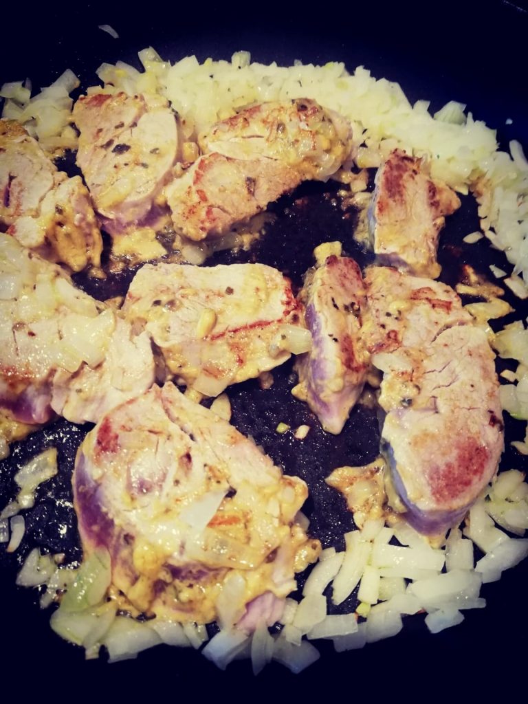 Diese mit ganz wenig Fett in einer Pfanne anbraten, bis diese leicht glasig sind. Dann das marinierte Fleisch dazugeben und von beiden Seiten kurz anbraten lassen.
