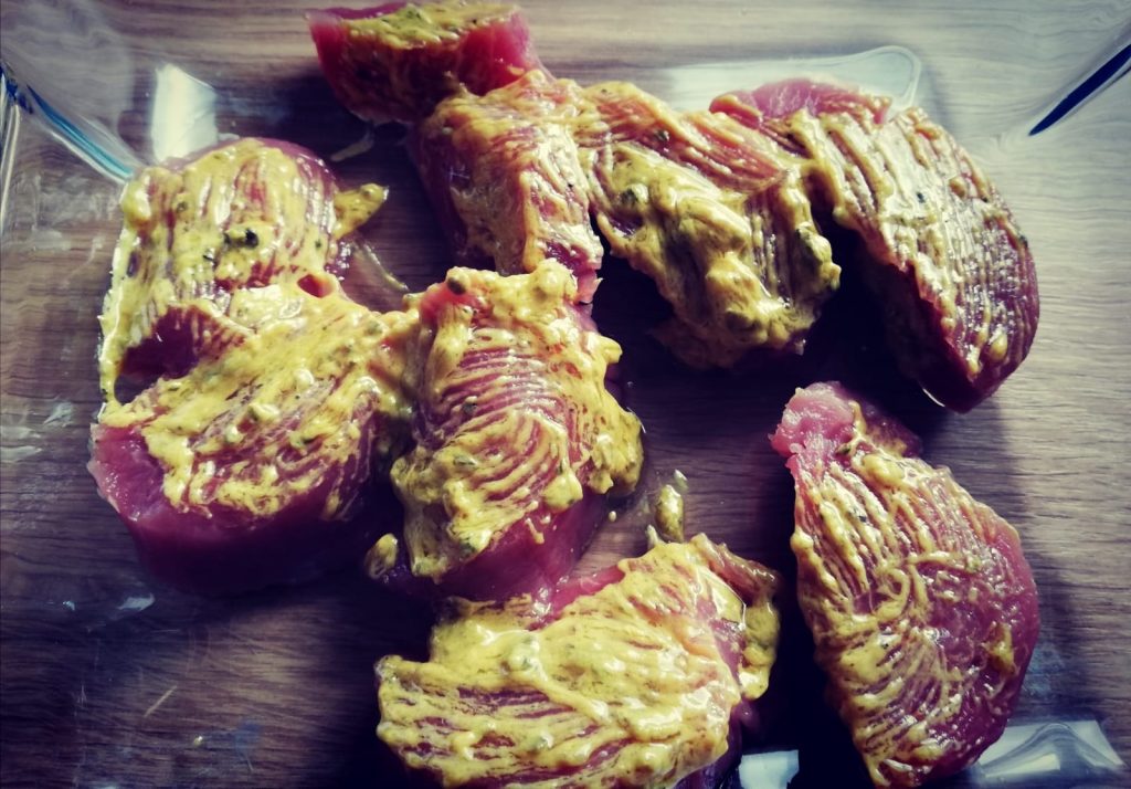 Dann das Schweinefilet in 2cm dicke Streifen schneiden und es mit der Marinade einpinseln.