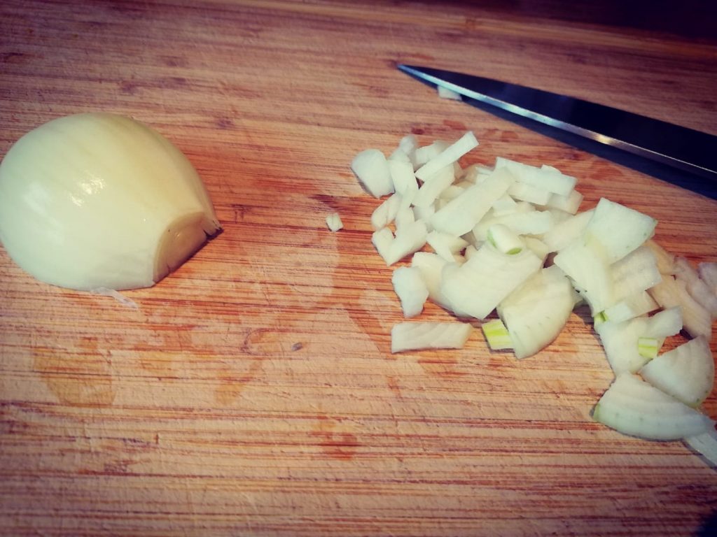 Während die Nudeln und die Möhren köcheln, können die anderen zwei Zwiebeln sehr fein geschnitten werden.