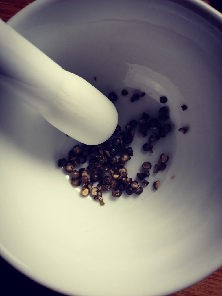 Zuerst das Wasser für die Nudeln anstellen. Dann die Marinade für das Fleisch herstellen. Dafür den grünen Pfeffer mit einem Mörser zerdrücken.