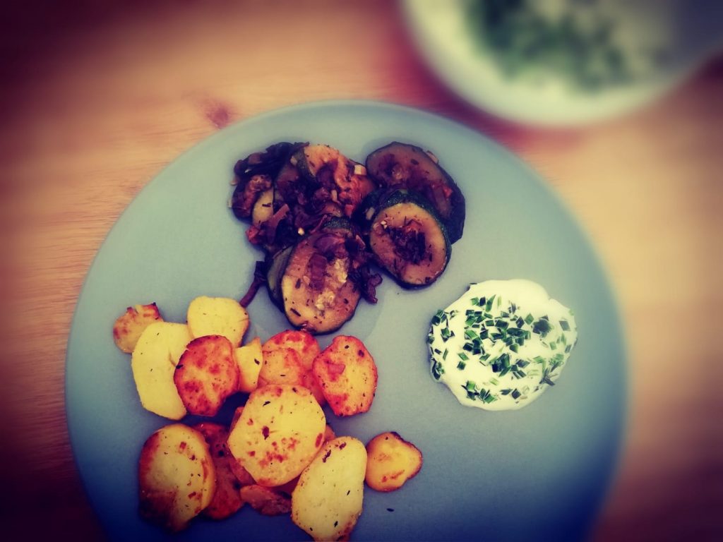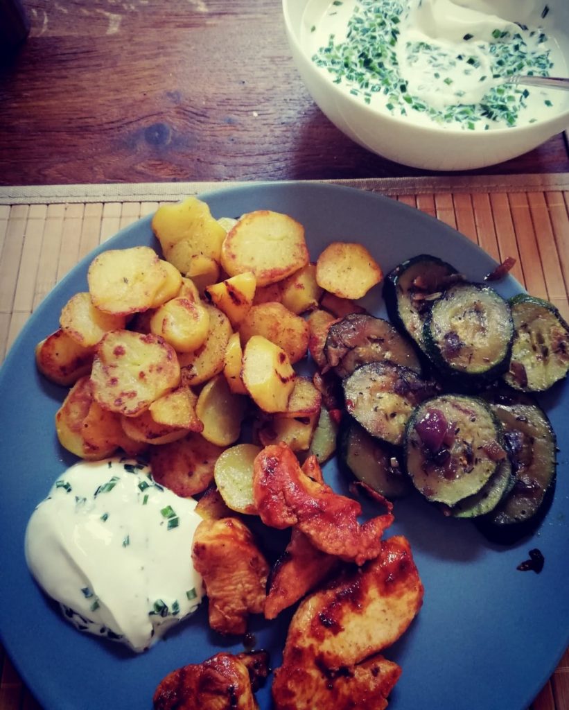 Bratkartoffeln mit Zucchinigemüse und Joghurtdip