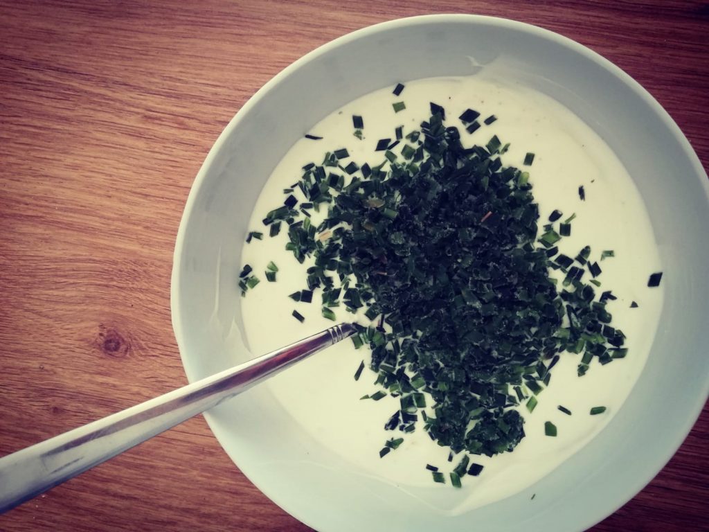 Während alles vor sich hin brutzelt, kann der Joghurt-Dip gemacht werden. Dafür den Joghurt mit Creme Fraîche verrühren und Salz, Pfeffer sowie, wer mag, noch eine kleine Zehe gepressten Knoblauch zugeben. Am Schluss mit Schnittlauch garnieren. Ich selber benutze meist eingefrorenen, da ich keinen grünen Daumen habe und mir meist die Kräuter zu schnell eingehen…