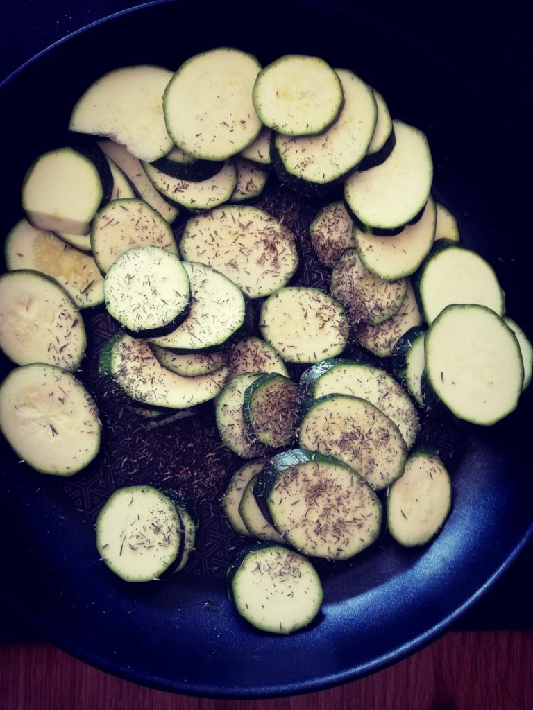 Dann die Zucchini waschen und die Enden abschneiden. Die Zwiebel schälen sowie den Knoblauch. In eine andere Pfanne einen guten Schuss Olivenöl schütten und warten bis die Pfanne eine gute Hitze ausstrahlt. In der Zeit die Zucchini in Scheiben schneiden und in die Pfanne geben. Ebenfalls den Thymian. Damit muss auch nicht gespart werden. Ab jetzt zwischendurch wenden und auf mittlere Hitze reduzieren. Währenddessen können die Zwiebel und der Knoblauch gehackt und dann dazugegeben werden. Falls es schneller gehen soll, kann auch ein Deckel verwendet werden, dann aber alle 2 Minuten die Zucchini wenden um ein Anbrennen zu vermeiden.
