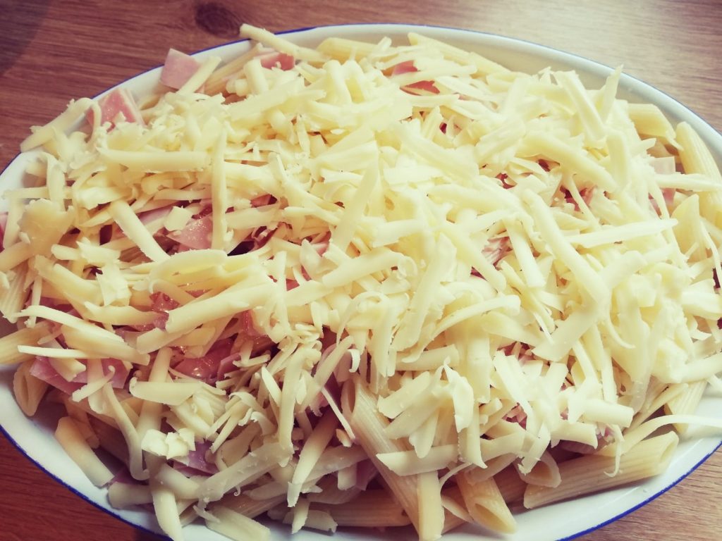 Die Nudeln ruhig noch sehr bissfest abschütten und in eine Auflaufform geben. Den Schinken und die Sauce untermengen und jetzt nur noch den Käse darüberstreuen.