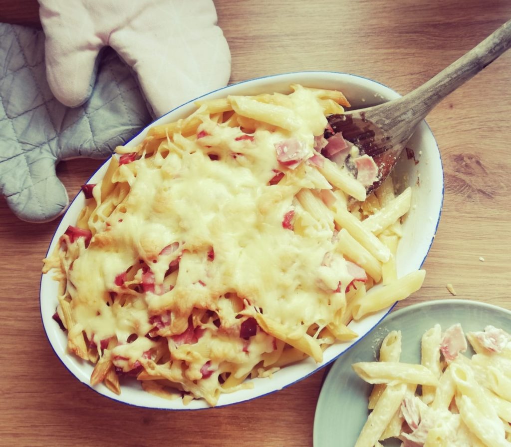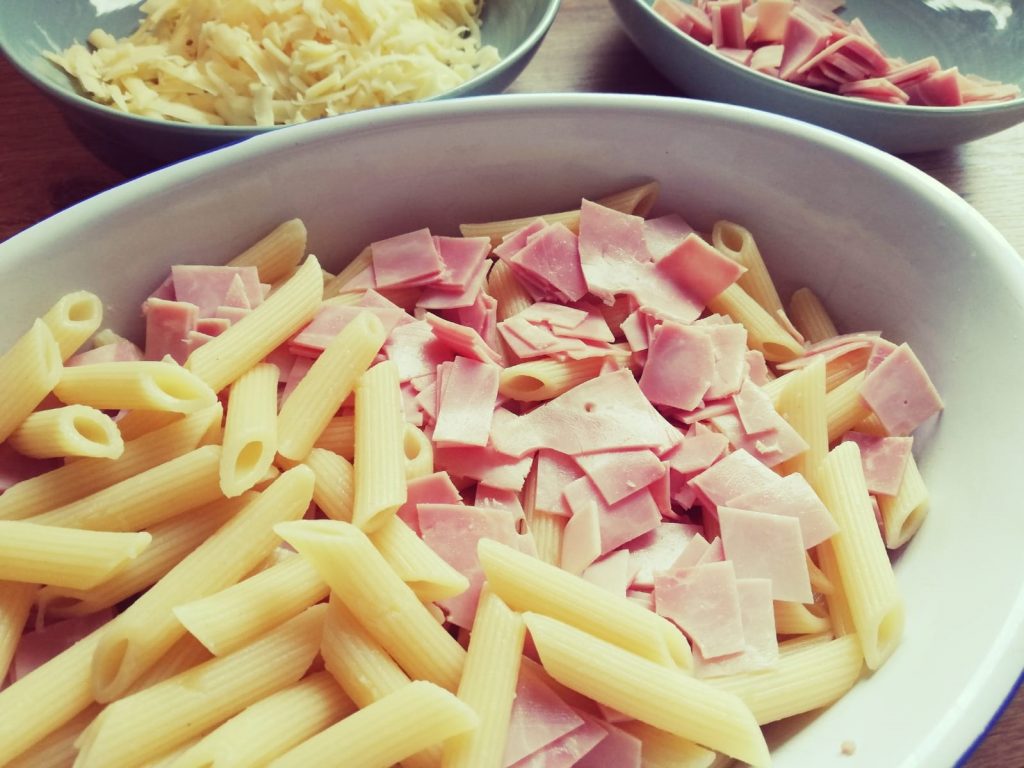 Nudelauflauf wird von jedem in unserer Familie geliebt und ist mit wenigen Zutaten schnell zubereitet. Wir mögen ihn am liebsten klassisch, also mit Schinken und Käse, aber es kann natürlich viel variiert werden. Alle möglichen Gemüsesorten passen dazu, wie zum Beispiel Erbsen oder Brokkoli. Hier kommt aber die ganz einfache Version.