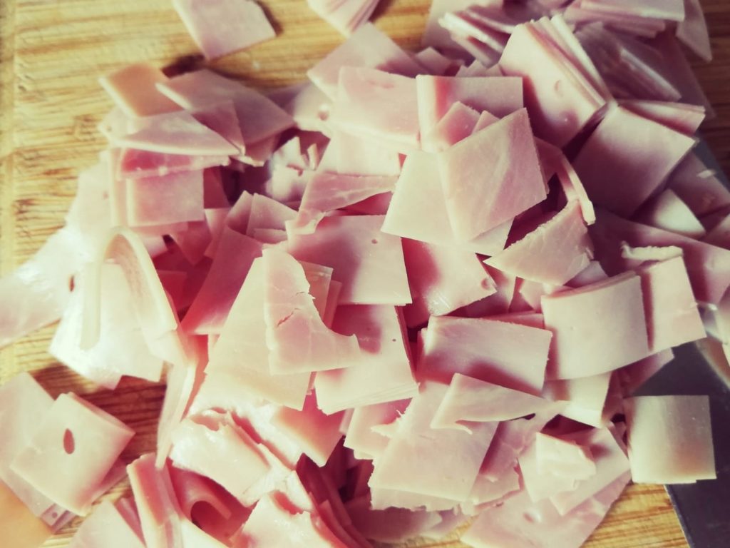 Ich koche die Nudeln immer separat, da ich es nicht mag, wenn einzelne Nudeln noch hart bleiben, wenn sie zu wenig Sauce abbekommen. Also Wasser aufsetzen und während auf das Blubbern gewartet wird, kann der Schinken geschnitten werden.