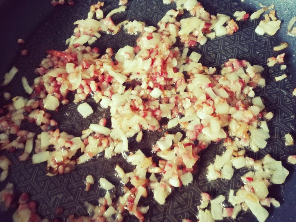 Nudelwasser für die Spaghetti aufsetzen. Dann den Speck und die Zwiebeln anbraten. Der Speck sollte knusprig und die Zwiebeln glasig sein.