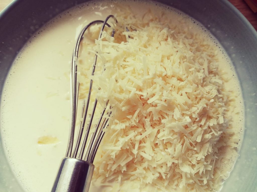 Sahne, Creme Fraiche und Parmesan unter das Ei mit drunter mischen.